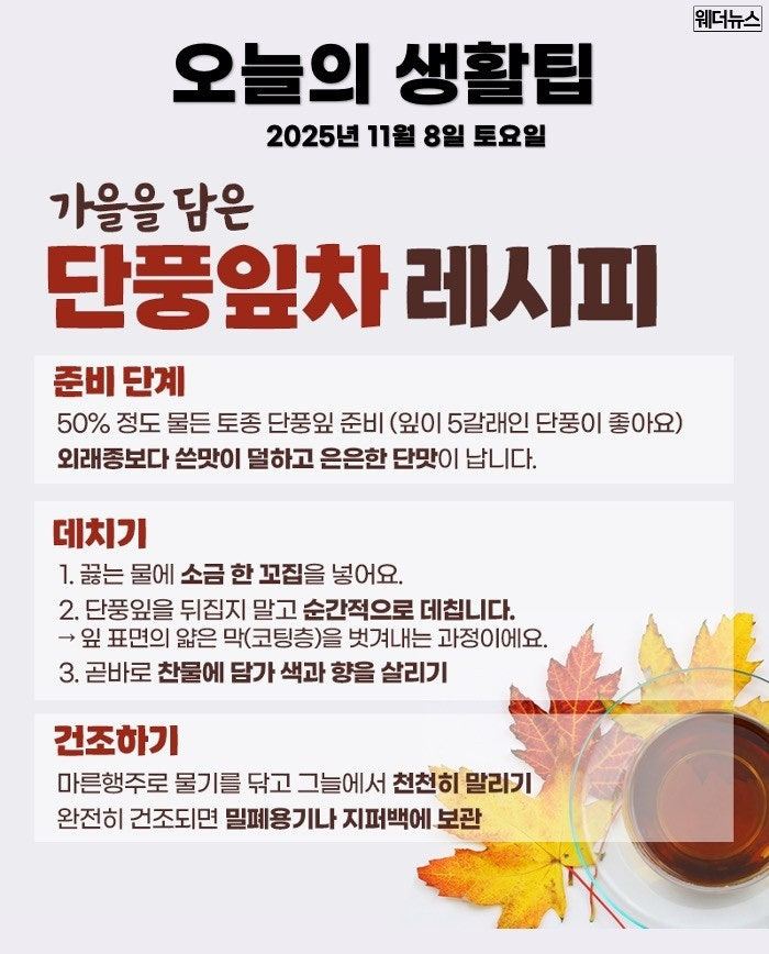 이맘때 붉게 물든 단풍잎을 활용해 가을의 향기와 색을 그대로 담은 단풍잎차를 만들어보는 건 어떨까요?