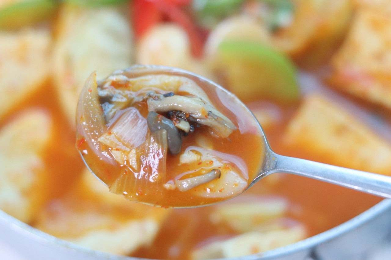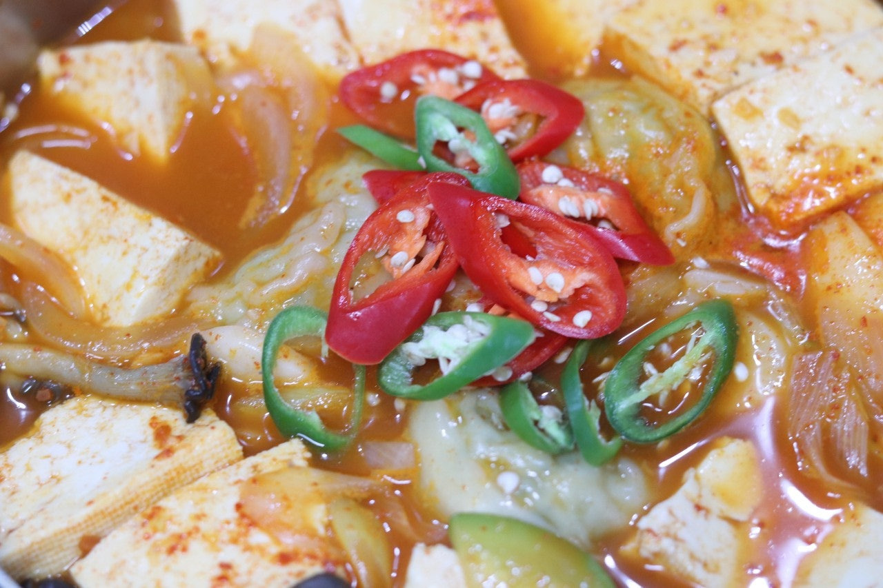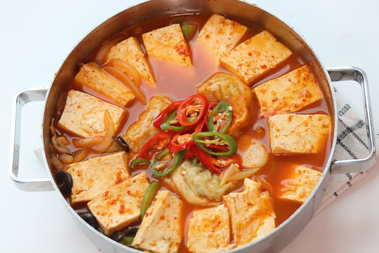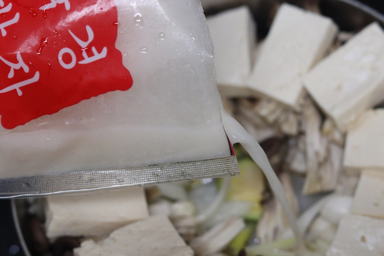 📍재료 - 두부 1모, 만두 3개, 양파 1/2개, 애호박 1/2개, 대파 1/2대, 느타리버섯 1/2팩, 청양고추 1/2개, 홍고추 1/2개, 사골육수 1팩(500ml), 냉동만두 2~3개