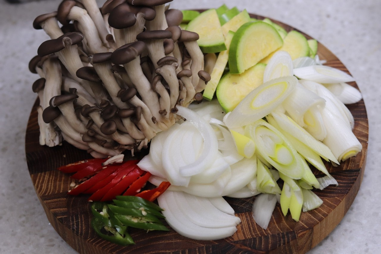 1. 양파는 채 썰고 애호박은 반달썰기, 고추와 대파는 어슷 썰어주고 느타리는 밑동을 썰고 가닥가닥 뜯어 준비해 줍니다.