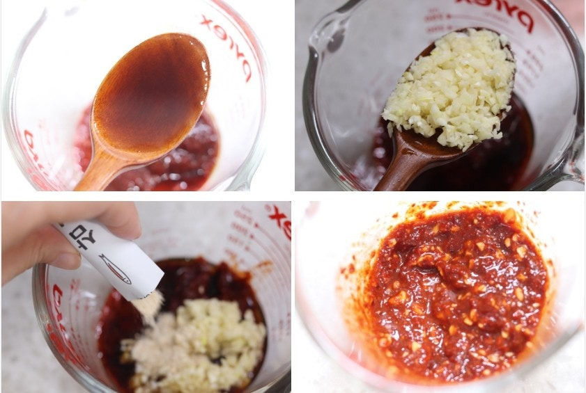 📍양념 - 고춧가루 2스푼, 고추장 1스푼, 홍게간장(국간장) 2스푼, 액젓 2스푼, 알룰로스 2스푼, 다진 마늘 1스푼, 스틱육수 1포