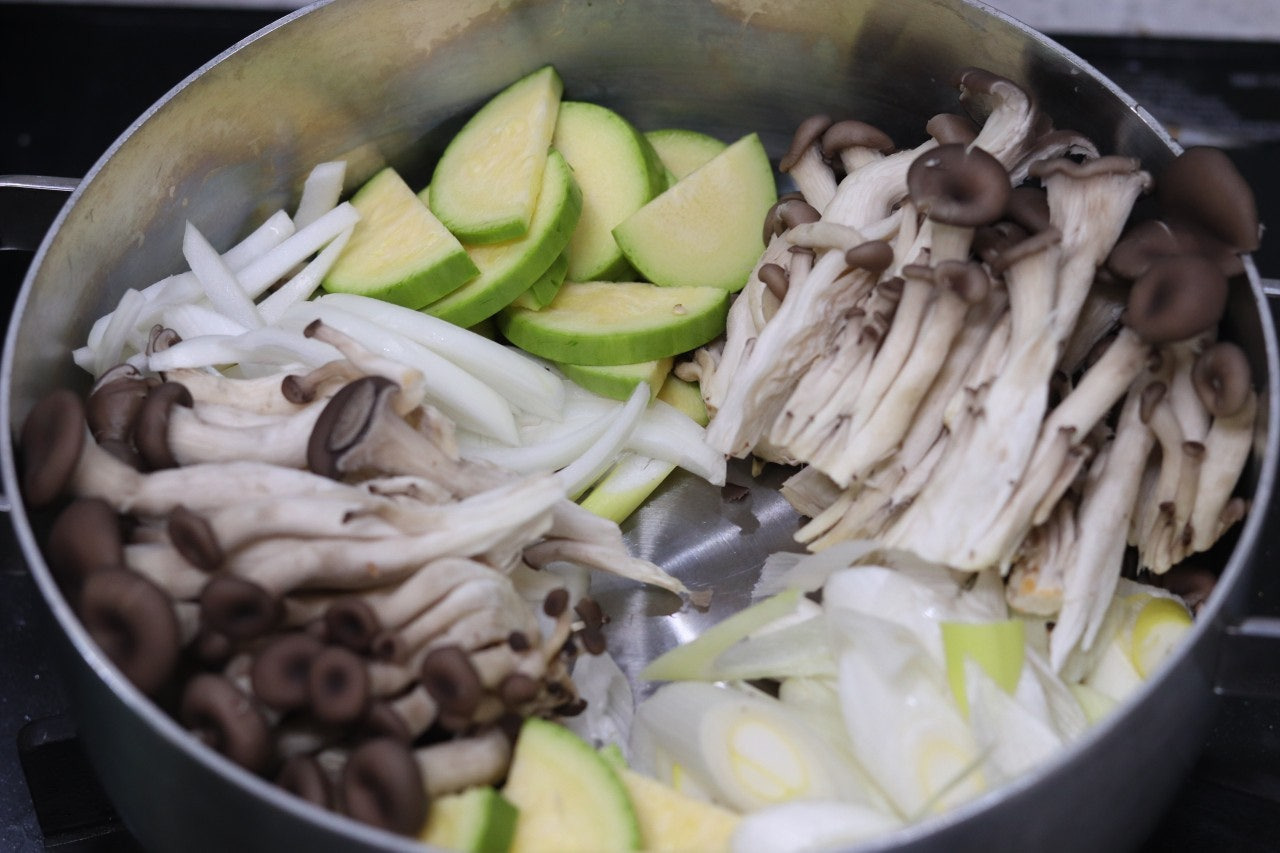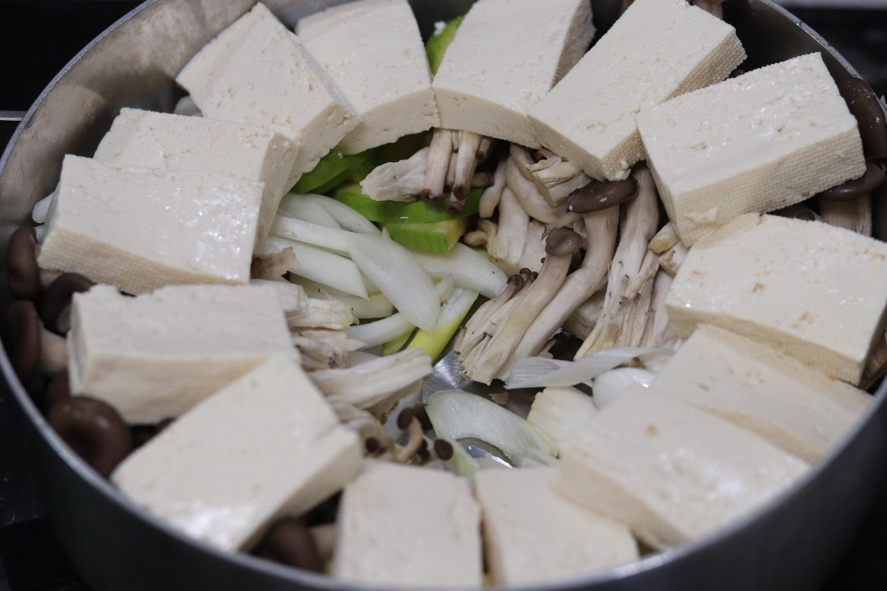 3. 냄비에 버섯, 대파, 애호박, 양파를 깔고 위에 두부를 썰어 올려 줍니다.