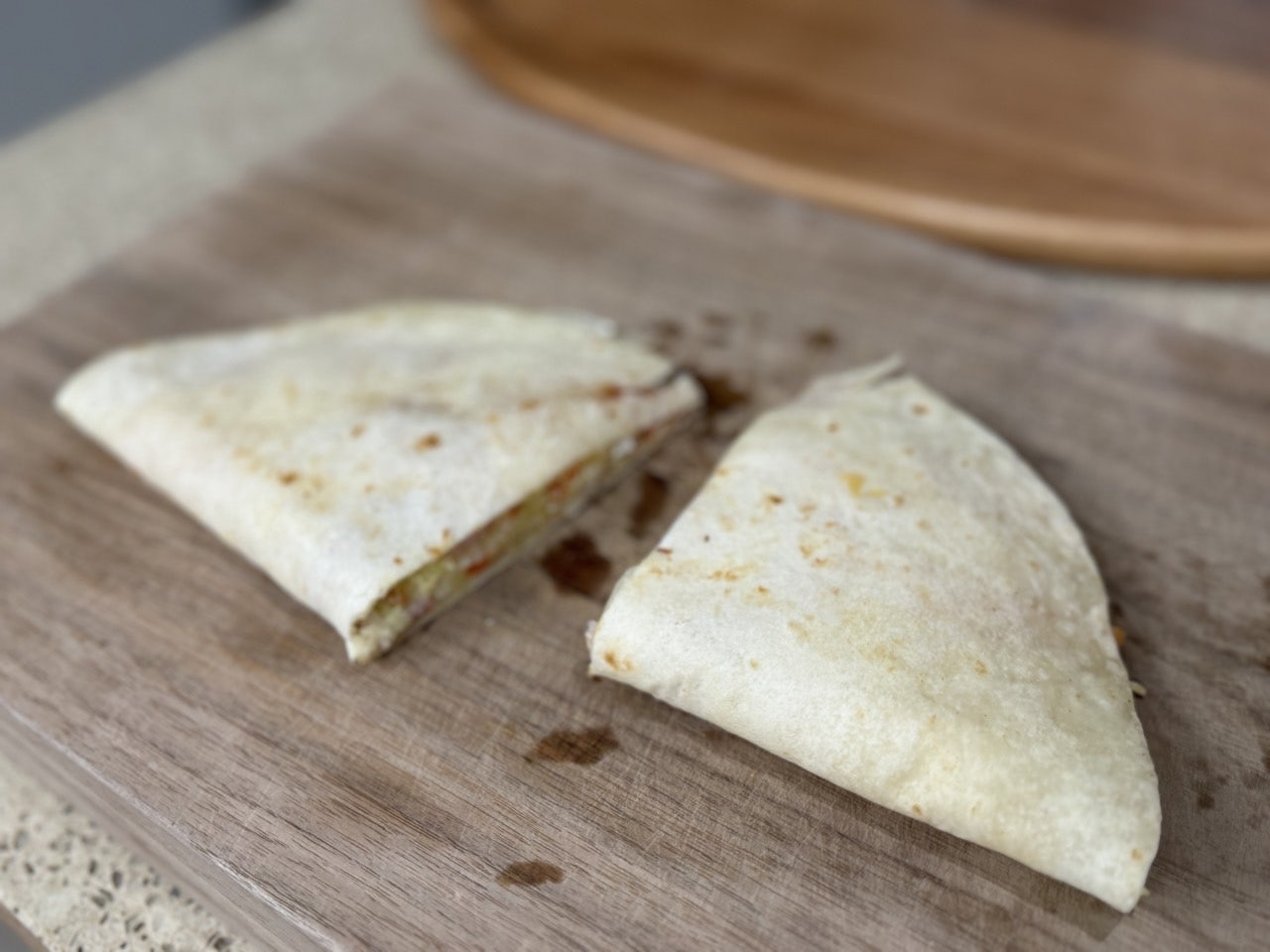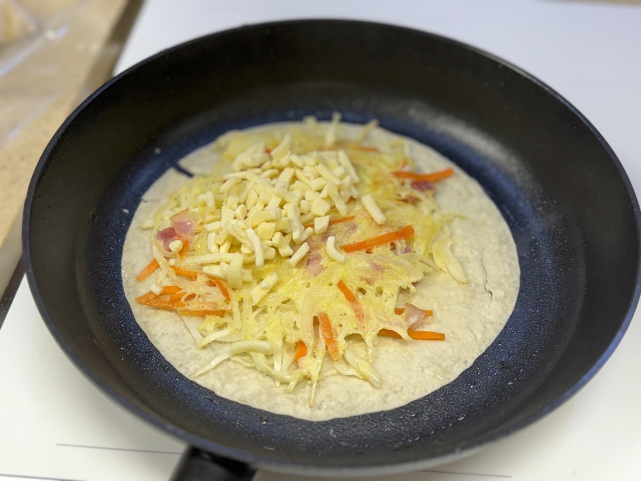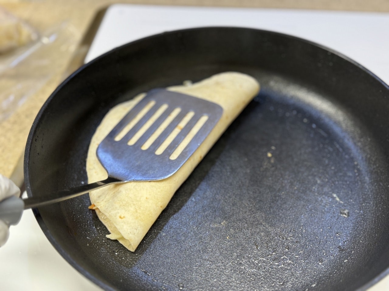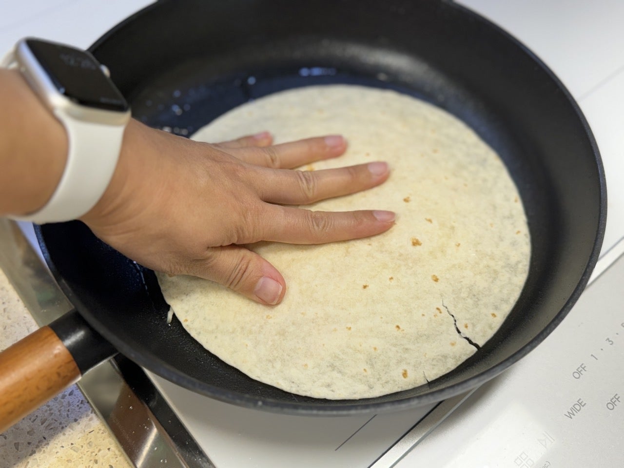 그리고 또띠아가 아래로 향하게 팬에 옮겨 담아주면 편하답니다.