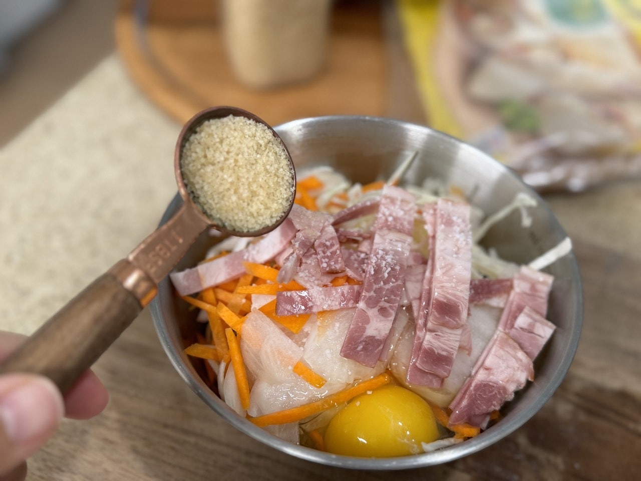 소금 두 꼬집과 설탕 0.5T를 넣어 간을 해요.