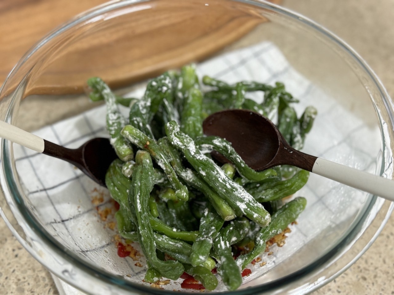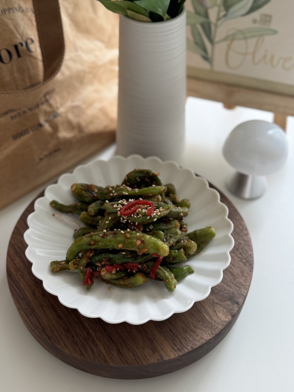 만들어둔 양념장에 한 김 식힌 꽈리고추를 넣어요.