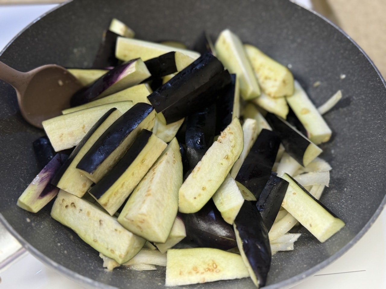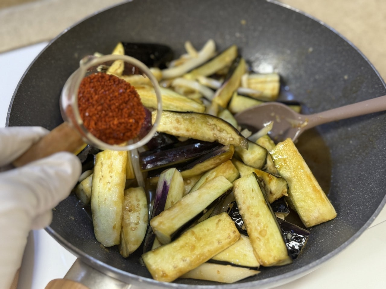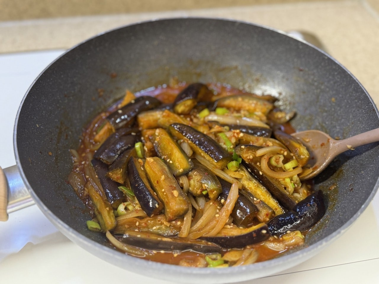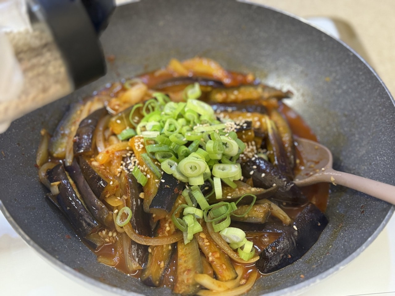 다음으로 가지를 넣고 1분 정도 섞어줘요.