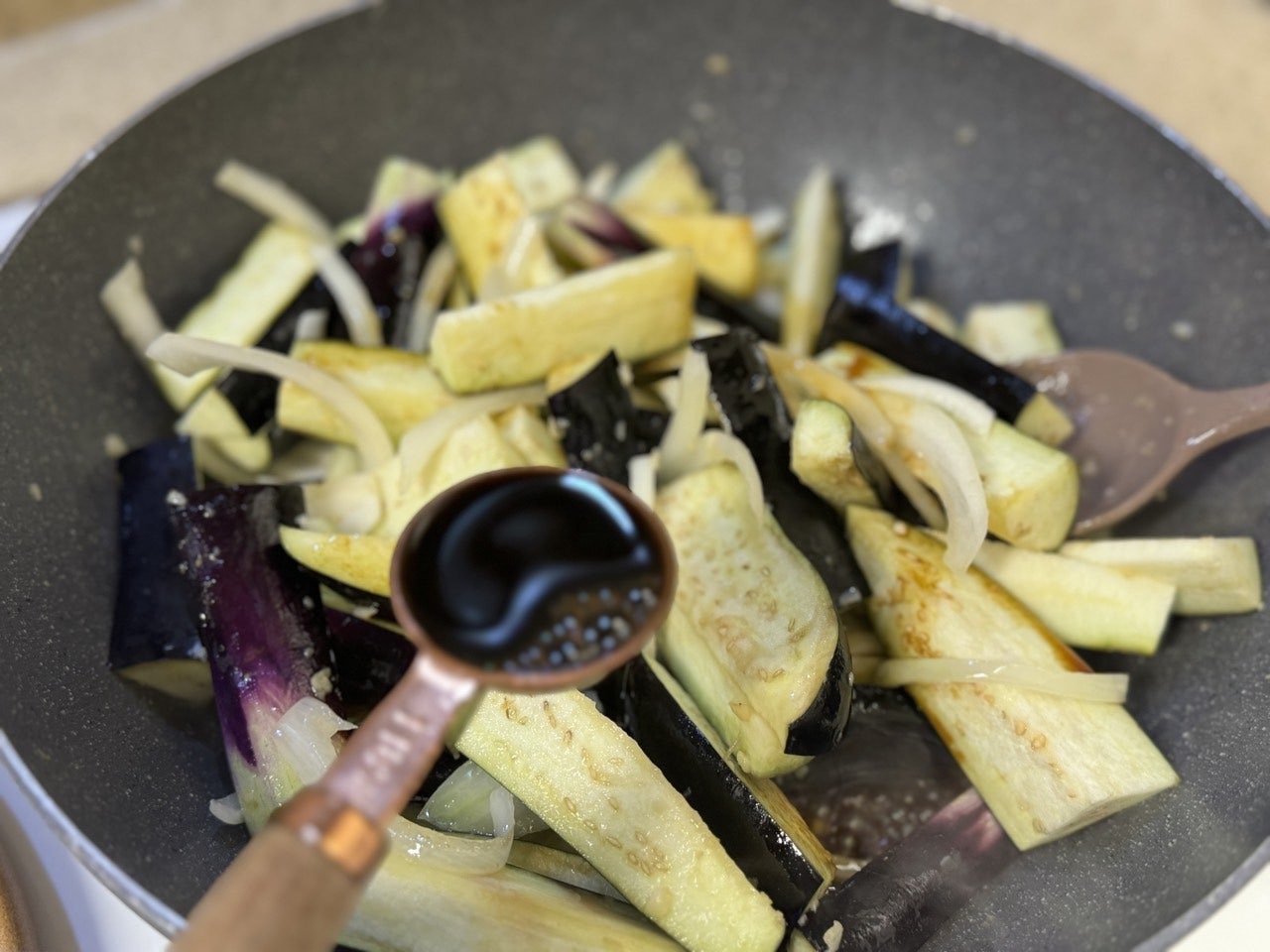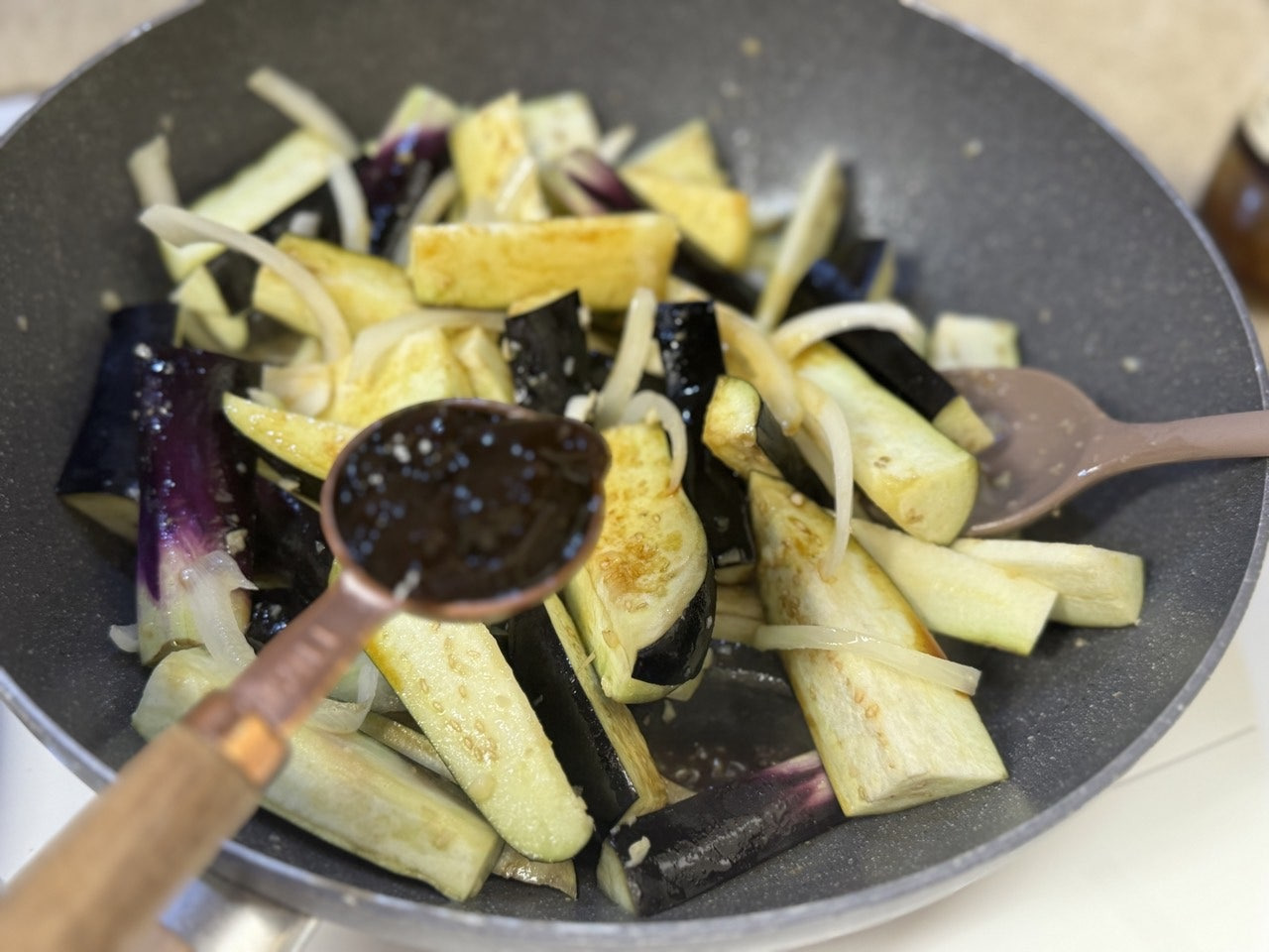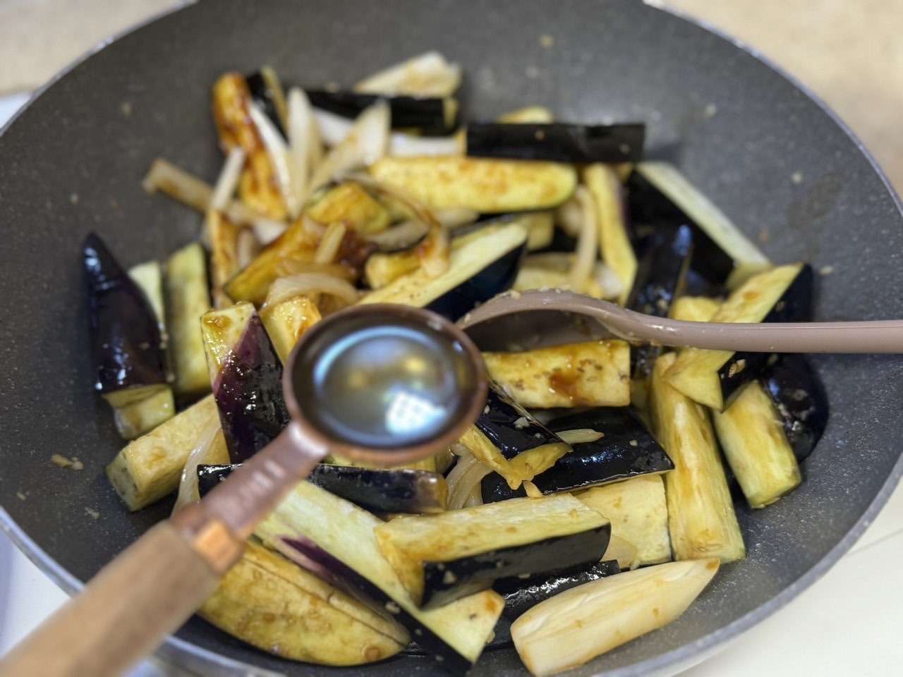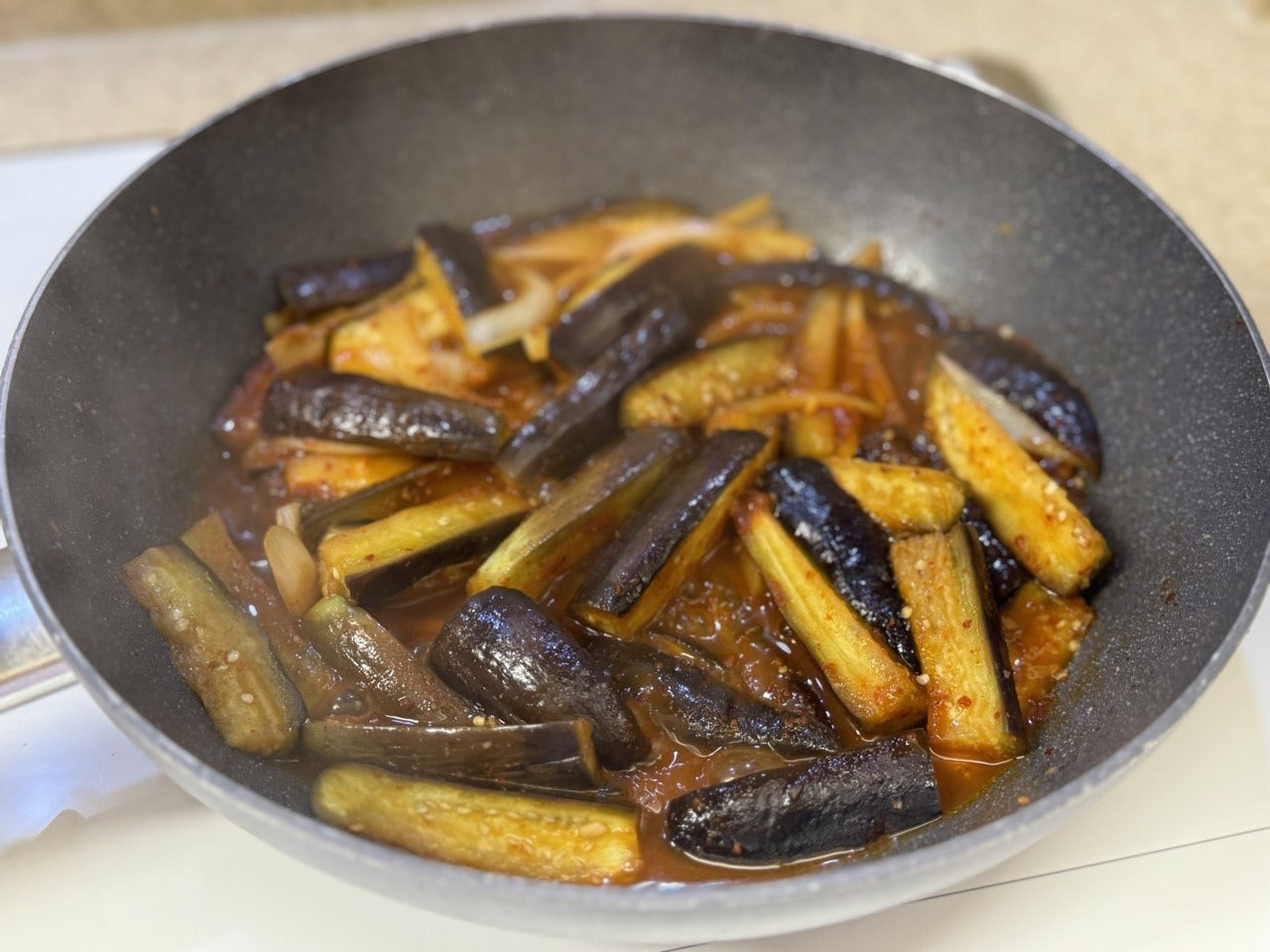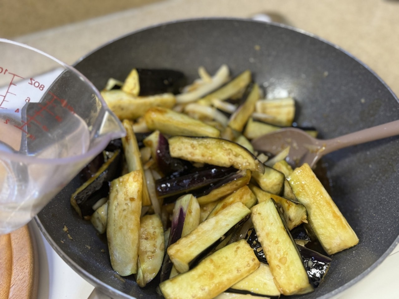 다음으로 가지를 넣고 1분 정도 섞어줘요.