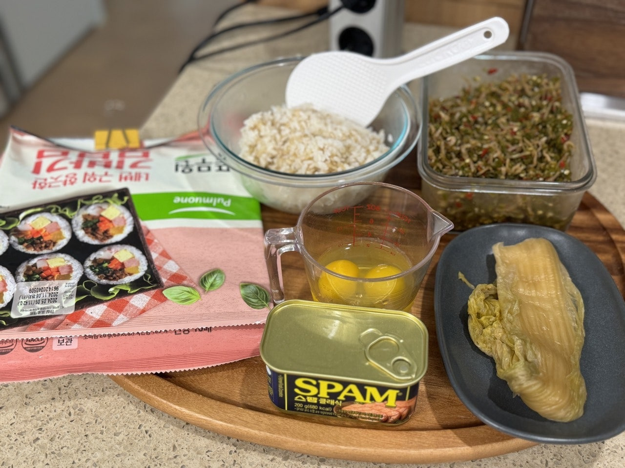 스팸 100g, 김치 2장, 김밥 김 2장 반.