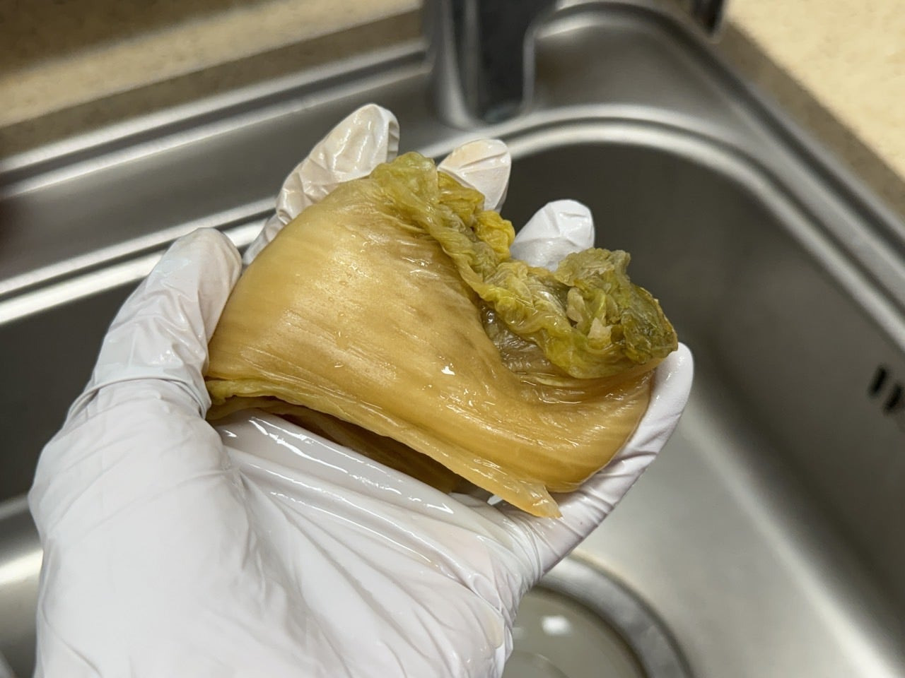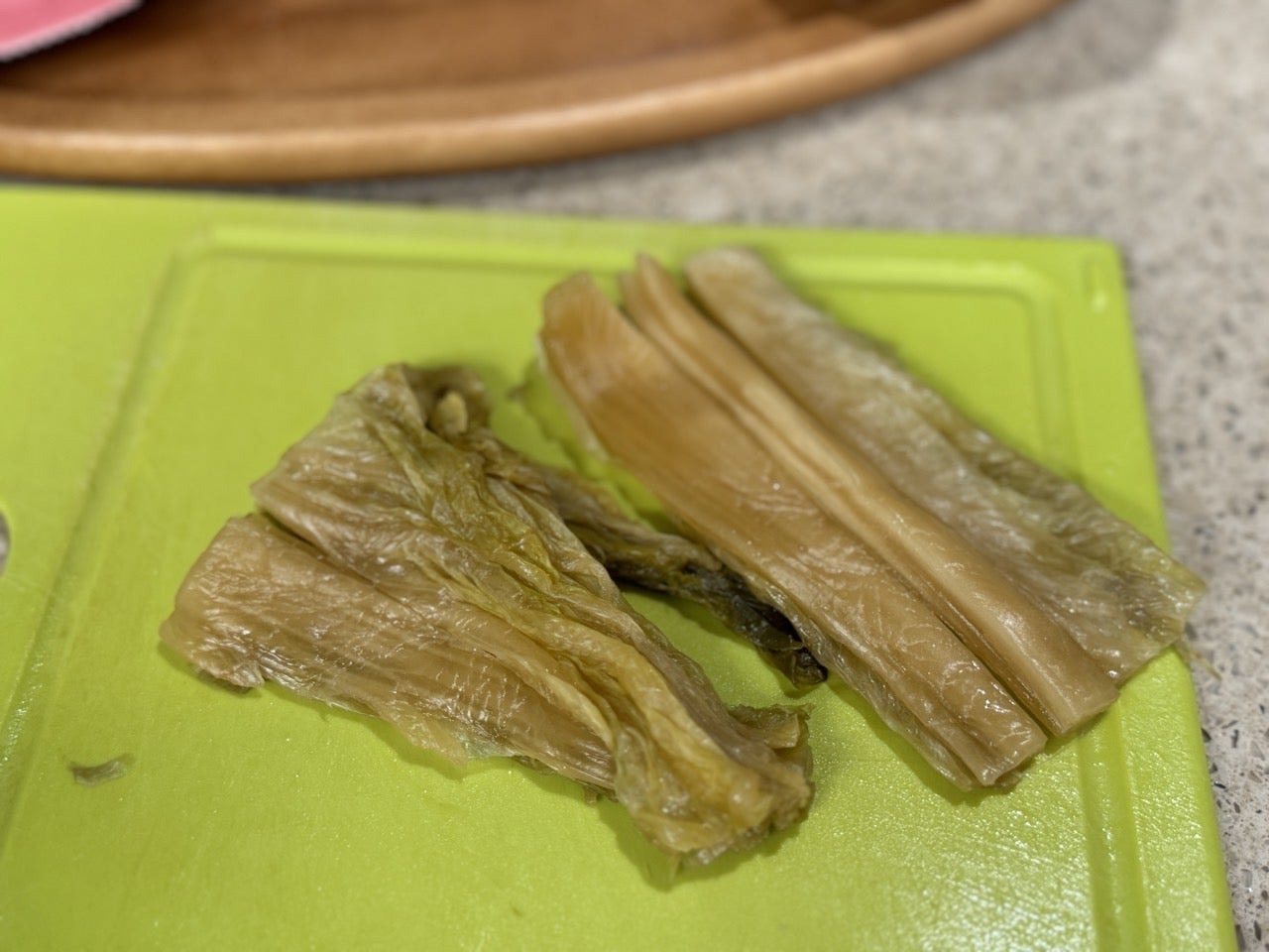 잘 익은 김치 두 장 떼어내어