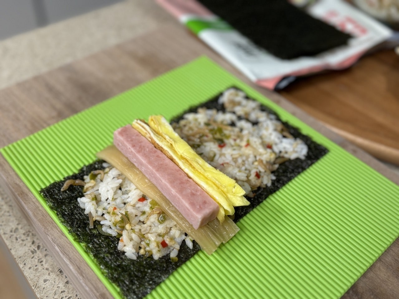 준비된 스팸, 김치, 계란지단을 올려줍니다.