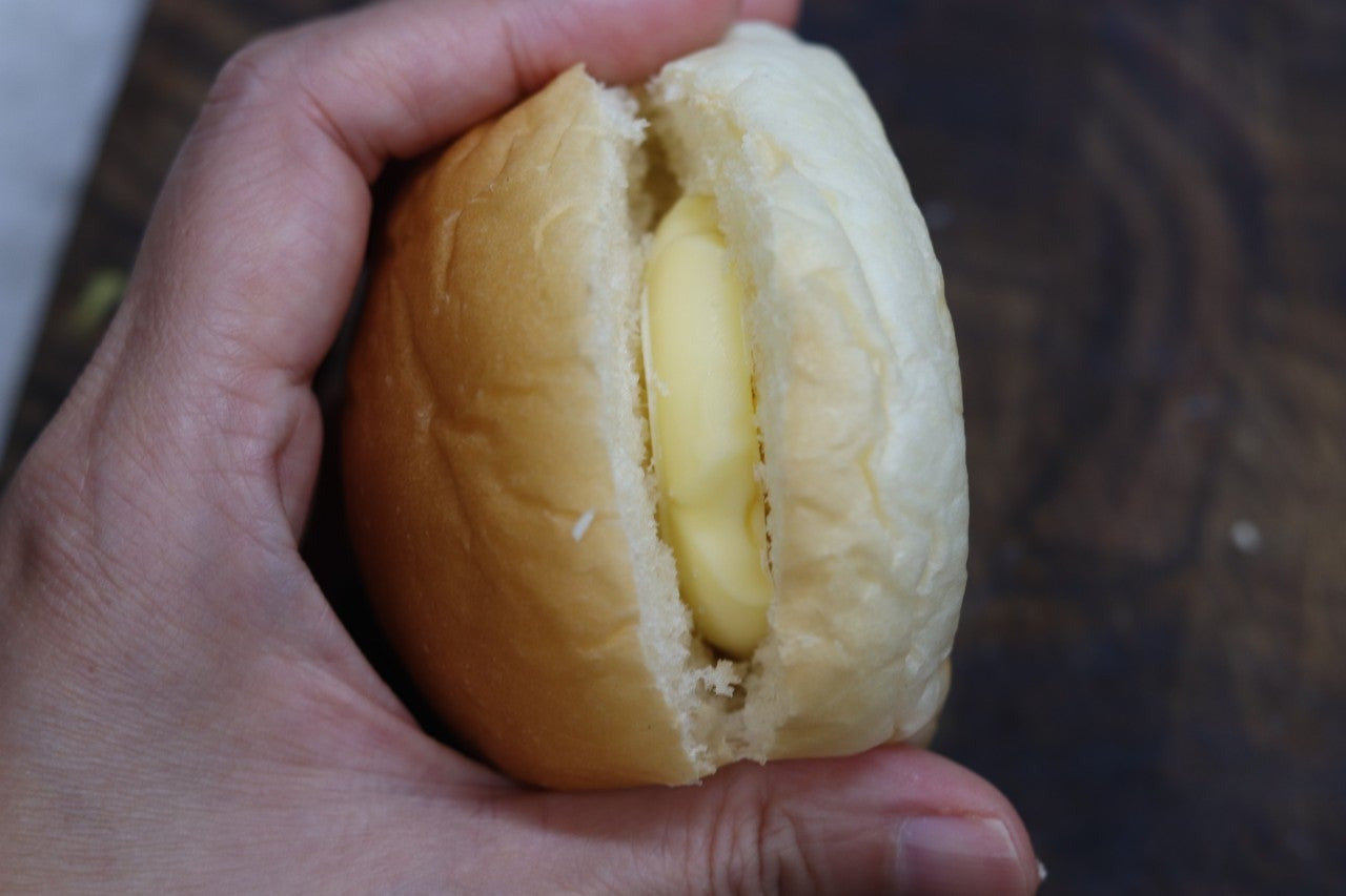 1. 모닝빵에 가로로 반 정도 썰어준 후에 버터를 넣어 줍니다.