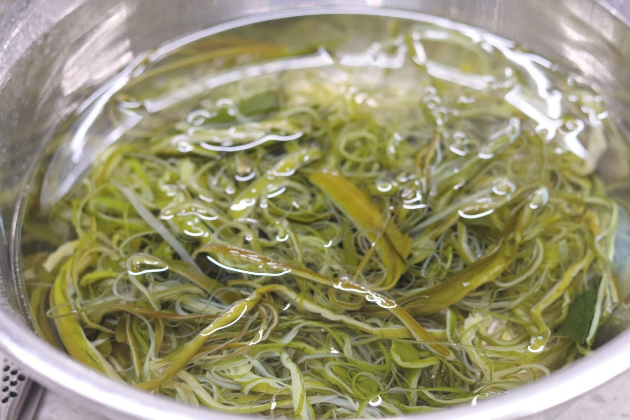 2. 염장미역줄기는 물에 2~3번 헹궈준 후에 물에 2~30분 정도 담가 짠기를 빼줍니다.