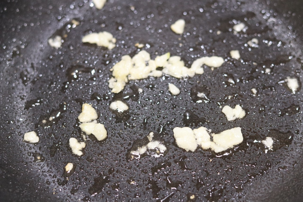4. 프라이팬에 오일을 두르고 다진마늘 1T를 볶아 마늘 기름을 내줍니다.