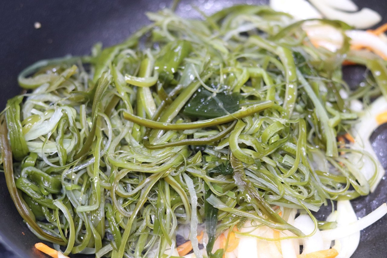 5. 미역줄기를 넣고 맛술 1T를 넣고 3분 정도 볶아 줍니다.