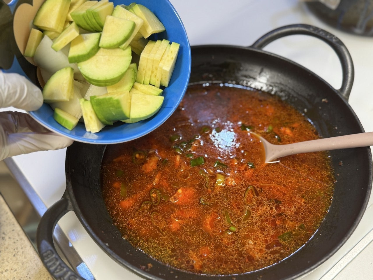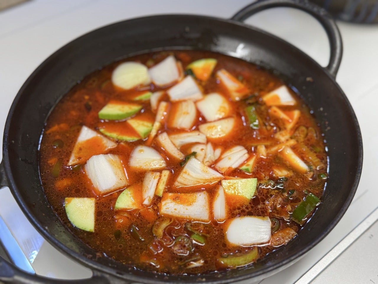 이제 물 300m와 애호박, 양파를 넣어주세요.
