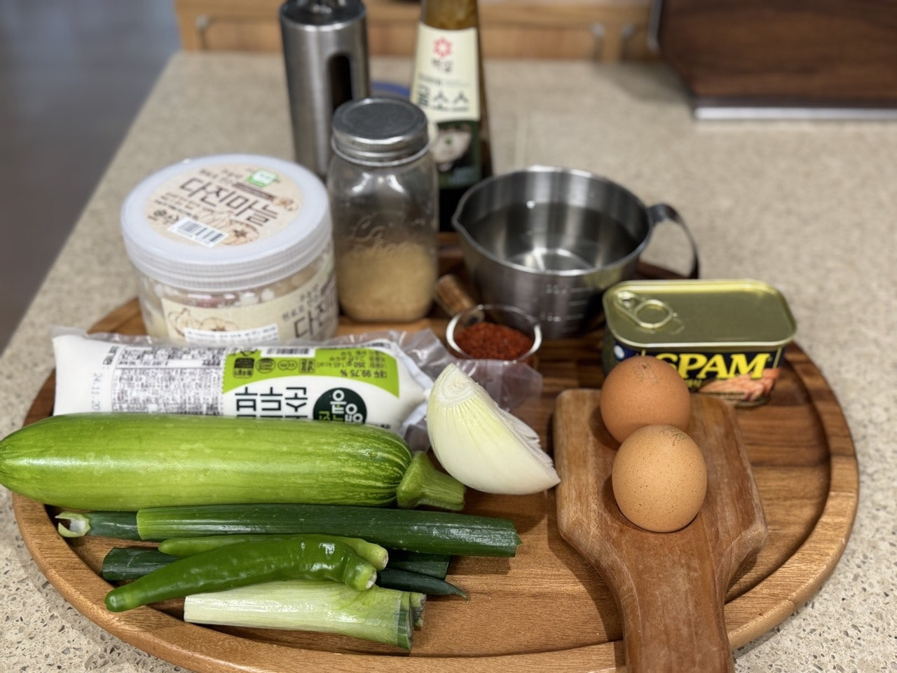 양파 1/2개, 애호박 1/3개, 스팸 200g,
