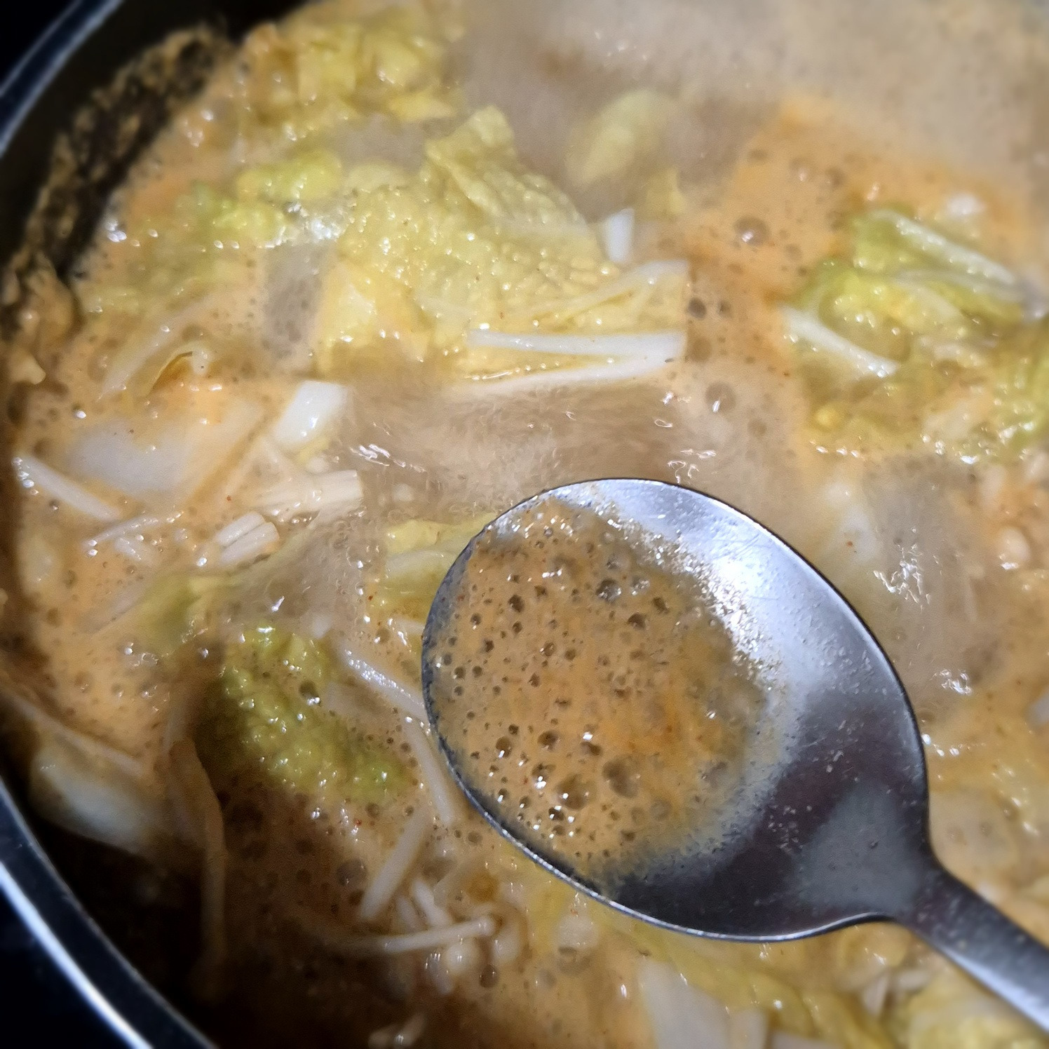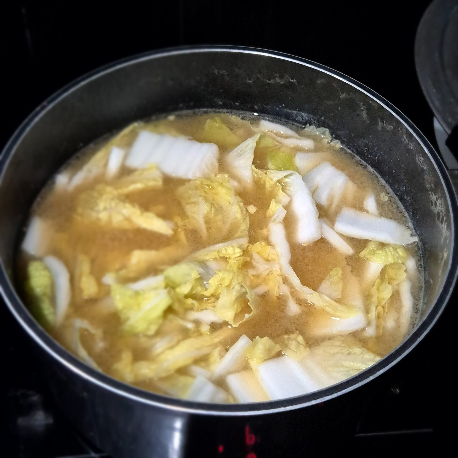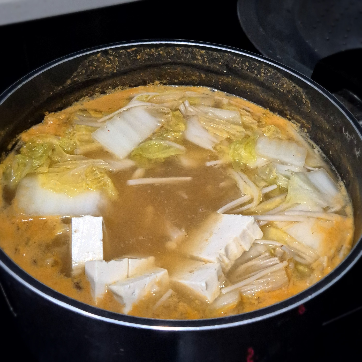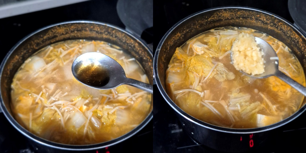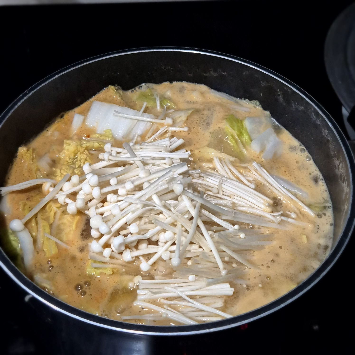 배추와 팽이버섯을 넣고 20분 정도 중간불에서 끓여줍니다.