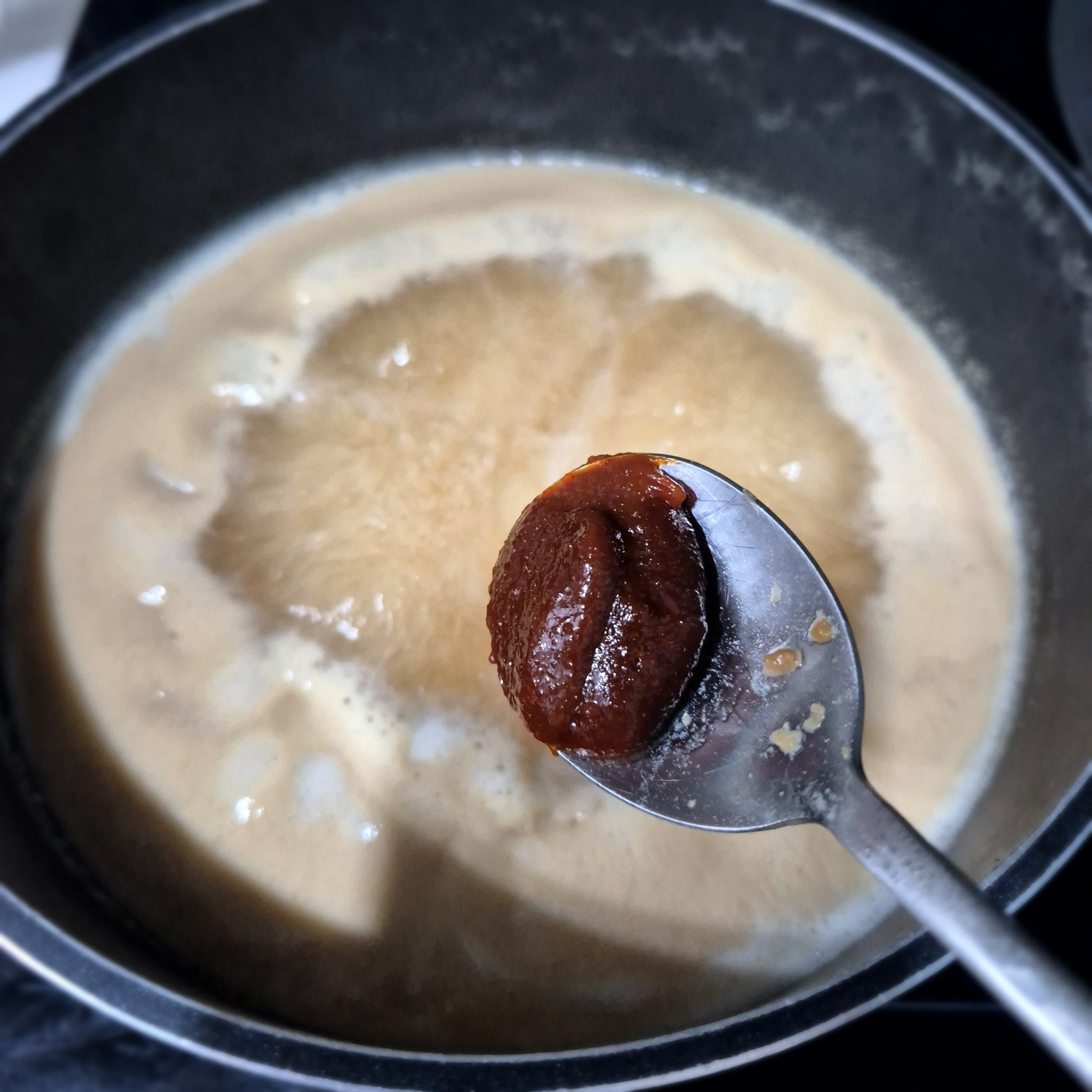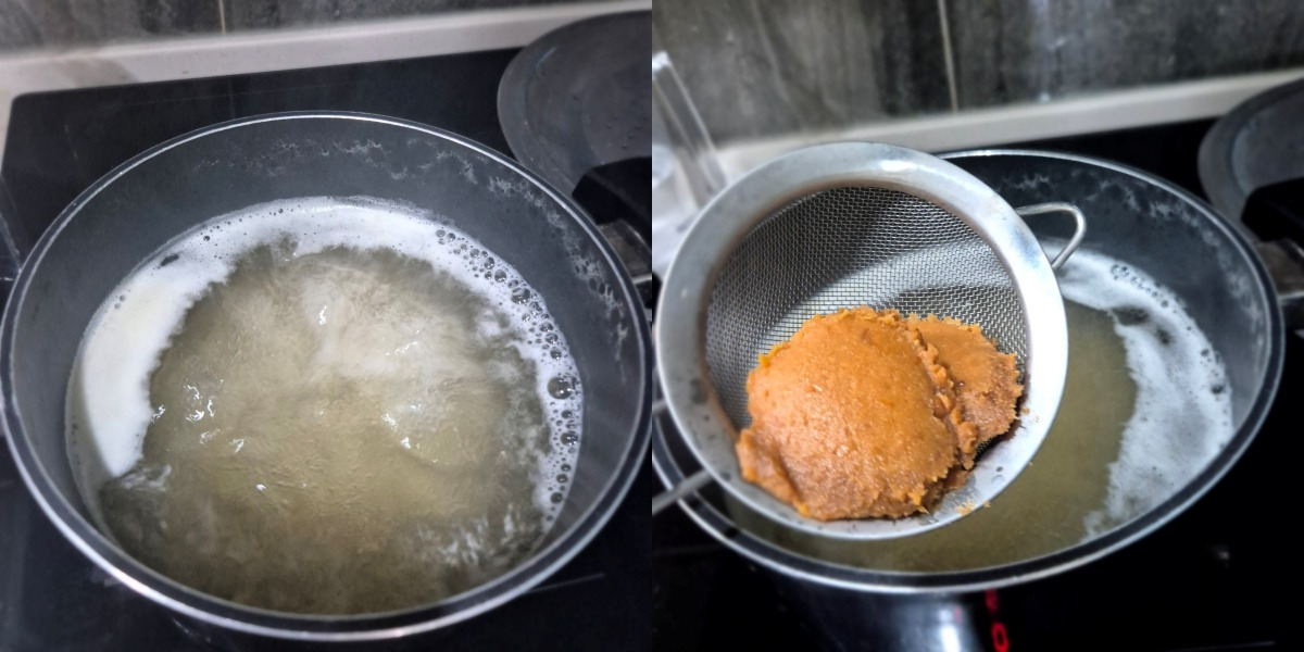 육수가 우러나면 다시팩을 건지고 된장 2큰술 채에 걸러줍니다.