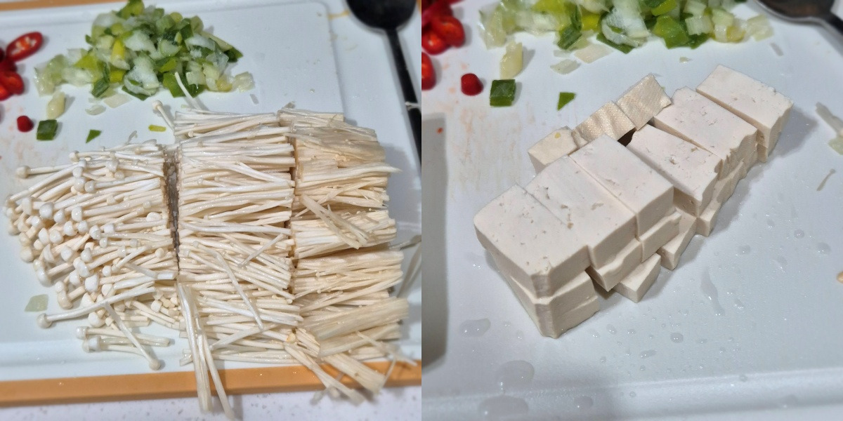 표고버섯을 넣으면 더욱 맛있지만 냉장고에 있는 팽이버섯과 두부를 잘라주시고요.