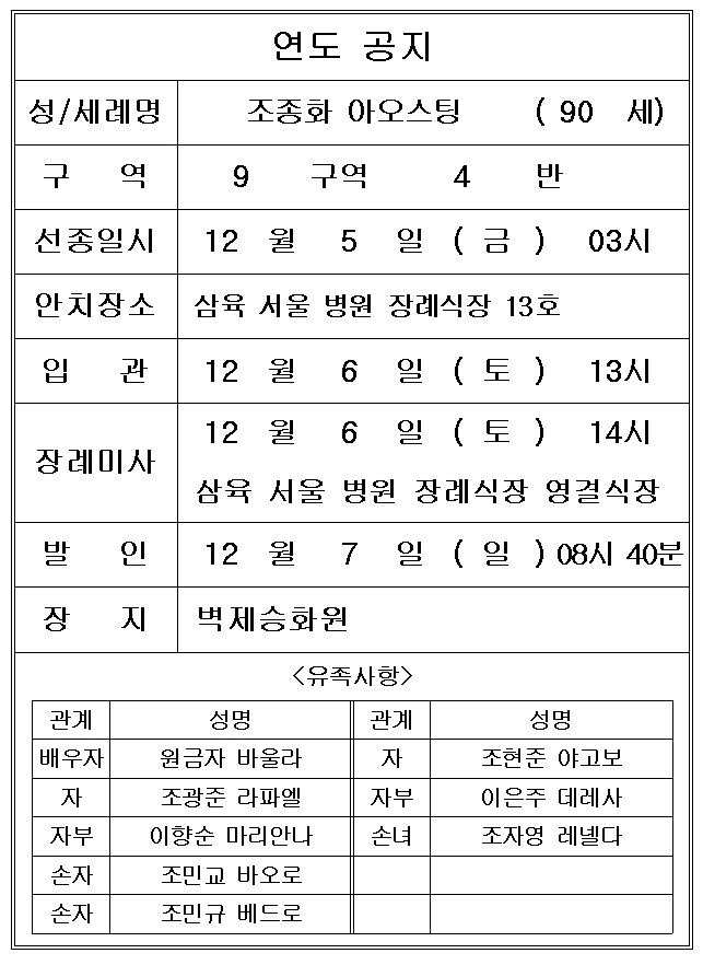 [[謹弔]]조종화 아오스팅(9구역) 작성자카페부지기|작성시간25.12.05|조회수64 목록 댓글 0 글자크기 작게가 글자크기 크게가 본당 9구역 조종화 아오스팅님께서 선종하셨습니다.신자분들은 故 조종화 아오스팅님을 위해 연도 바쳐주시고기도중에 고인을 기억해주시기 바랍니다. 다음검색 현재 게시글 추가 기능 열기 북마크 공유하기 신고 센터로 신고 댓글 댓글 0 댓글쓰기 답글쓰기 댓글 리스트