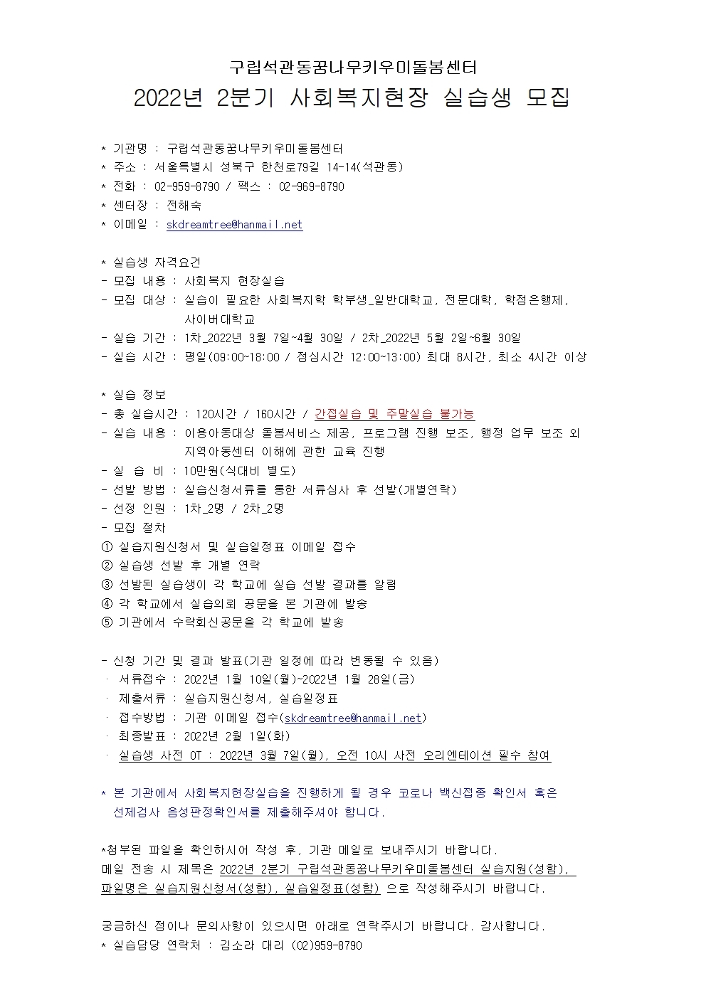 2022년도 2분기 사회복지현장 실습생을 모집합니다.