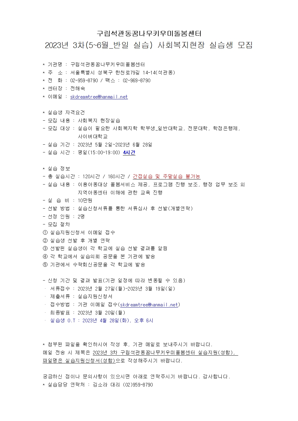 2023년 3차(5~6월_반일) 사회복지현장실습생 모집 공고 작성자석관꿈나무|작성시간23.03.03|조회수82 목록 댓글 0 글자크기 작게가 글자크기 크게가 실습지원신청서(성함).hwp39.50KB기관 이메일 접수 : skdreamtree@hanmail.net 첨부파일첨부된 파일이 2개 있습니다. hwp 파일 실습지원신청서(성함).hwp 다운로드 jpg 파일 2023년 3차(5~6월_반일) 사회복지현장실습생 모집공고.jpg 다운로드 다음검색 현재 게시글 추가 기능 열기 북마크 공유하기 신고 센터로 신고 댓글 댓글 0 댓글쓰기 답글쓰기 댓글 리스트