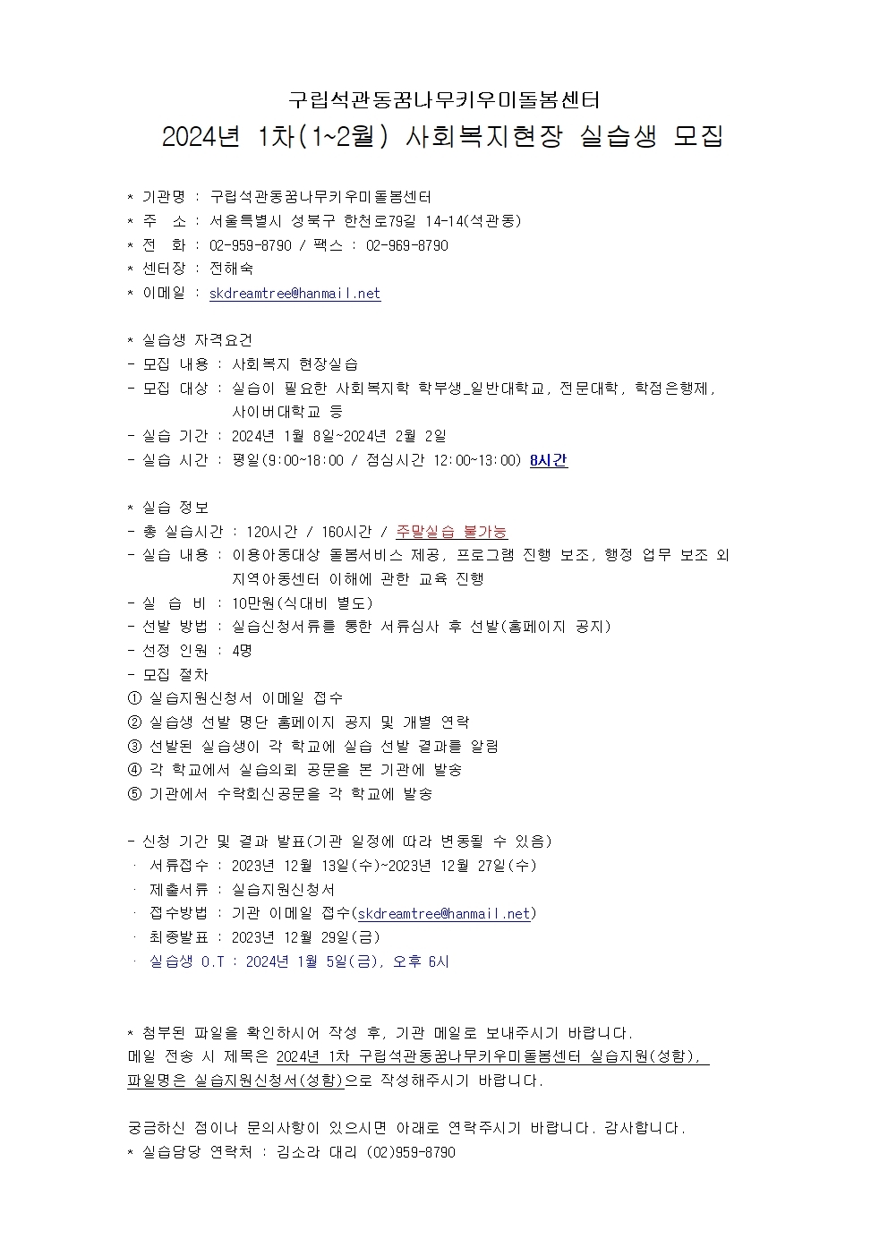 2024년 1차(1~2월) 사회복지현장실습생 모집 공고 작성자석관꿈나무|작성시간23.12.13|조회수278 목록 댓글 0 글자크기 작게가 글자크기 크게가 실습지원신청서(성함).hwp39.00KB 첨부파일첨부된 파일이 2개 있습니다. jpg 파일 2024년 1차 사회복지현장실습생 모집공고001.jpg 다운로드 hwp 파일 실습지원신청서(성함).hwp 다운로드 다음검색 현재 게시글 추가 기능 열기 북마크 공유하기 신고 센터로 신고 댓글 댓글 0 댓글쓰기 답글쓰기 댓글 리스트