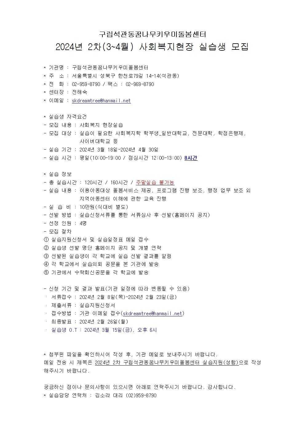 2024년 2차(3~4월) 사회복지현장실습생 모집 공고 작성자석관꿈나무|작성시간24.02.08|조회수231 목록 댓글 0 글자크기 작게가 글자크기 크게가 실습일정표(성함).hwp60.00KB실습지원신청서(성함).hwp39.00KB 첨부파일첨부된 파일이 3개 있습니다. jpg 파일 2024년 2차 사회복지현장실습생 모집공고001.jpg 다운로드 hwp 파일 실습일정표(성함).hwp 다운로드 hwp 파일 실습지원신청서(성함).hwp 다운로드 다음검색 현재 게시글 추가 기능 열기 북마크 공유하기 신고 센터로 신고 댓글 댓글 0 댓글쓰기 답글쓰기 댓글 리스트