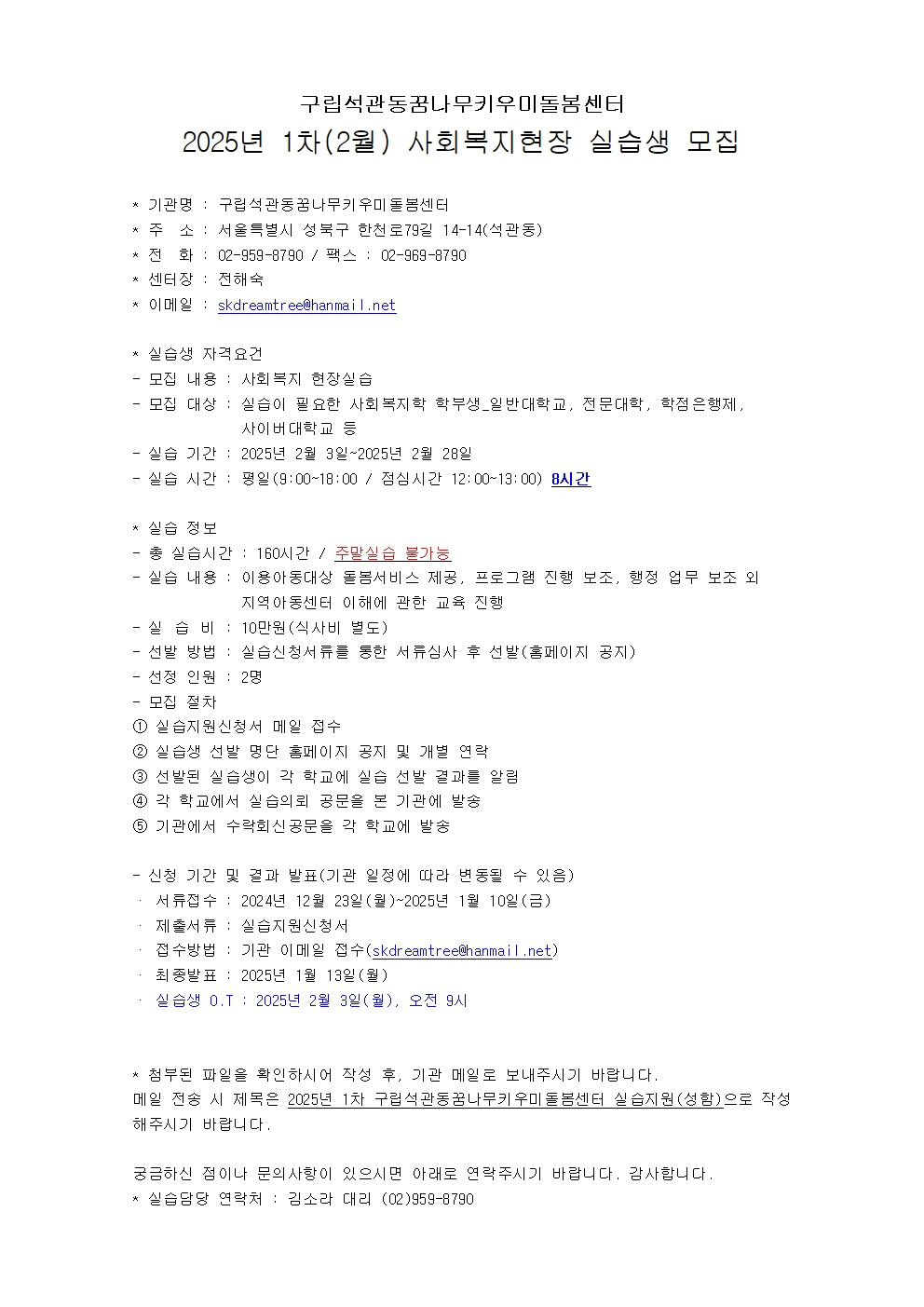 2025년 1차(2월) 사회복지현장실습생 모집 공고 작성자석관꿈나무|작성시간24.12.23|조회수135 목록 댓글 0 글자크기 작게가 글자크기 크게가 실습지원신청서_성함.hwp39.00KB 첨부파일첨부된 파일이 2개 있습니다. jpg 파일 2025년 1차 사회복지현장실습생 모집공고001.jpg 다운로드 hwp 파일 실습지원신청서_성함.hwp 다운로드 다음검색 현재 게시글 추가 기능 열기 북마크 공유하기 신고 센터로 신고 댓글 댓글 0 댓글쓰기 답글쓰기 댓글 리스트