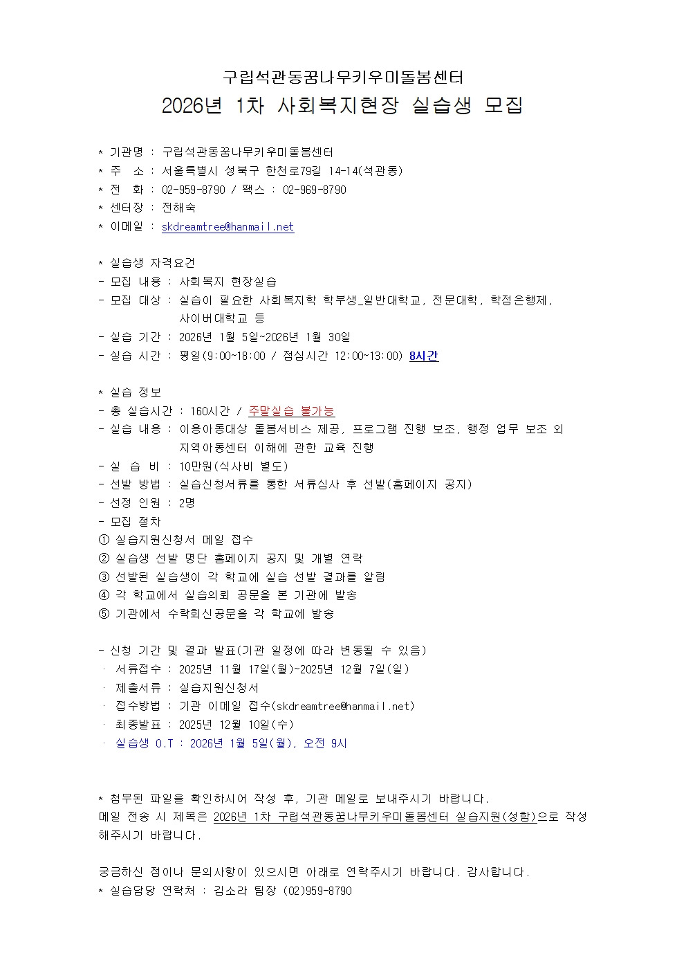 2026년 1차(1월) 사회복지현장실습생 모집 공고 작성자석관꿈나무|작성시간25.11.17|조회수33 목록 댓글 0 글자크기 작게가 글자크기 크게가 실습지원신청서_성함.hwp38.50KB 첨부파일첨부된 파일이 2개 있습니다. jpg 파일 2026년 1차 사회복지현장실습생 모집공고001.jpg 다운로드 hwp 파일 실습지원신청서_성함.hwp 다운로드 다음검색 현재 게시글 추가 기능 열기 북마크 공유하기 신고 센터로 신고 댓글 댓글 0 댓글쓰기 답글쓰기 댓글 리스트