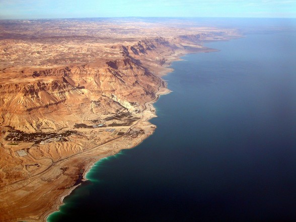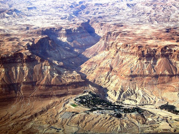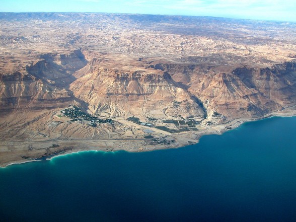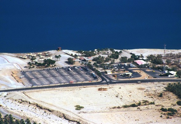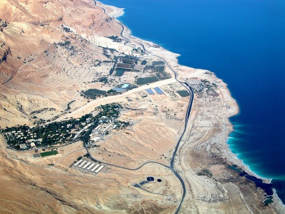 사진 왼쪽 중간 지점에 있는 곳이 엔 게디 키부츠. 키부츠 대각선 지점에 있는 곳이 엔 게디 해수욕장