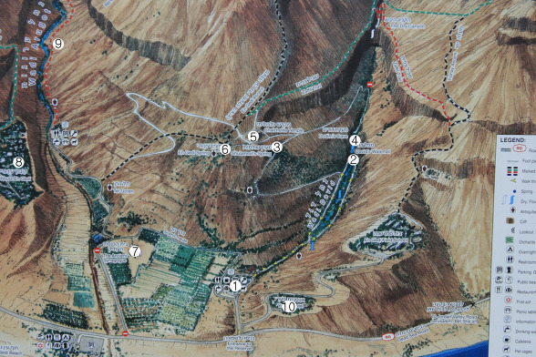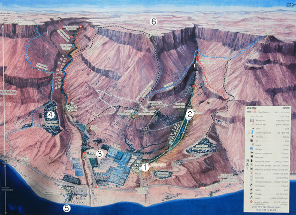 1.매표소 2.다윗폭포 3.슐람밑샘 4.도딤 동굴과 폭포 5.청동기시대 신전 6.엔 게디샘 7.시나고가 유적지 8.엔 게디 키부츠 9.아루곳천(Wadi Arugot) 10.유스호스텔 다윗천(Wadi David) : 1-4번으로 이어진 계곡