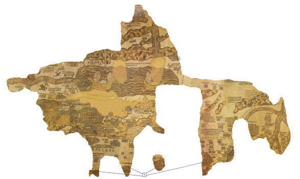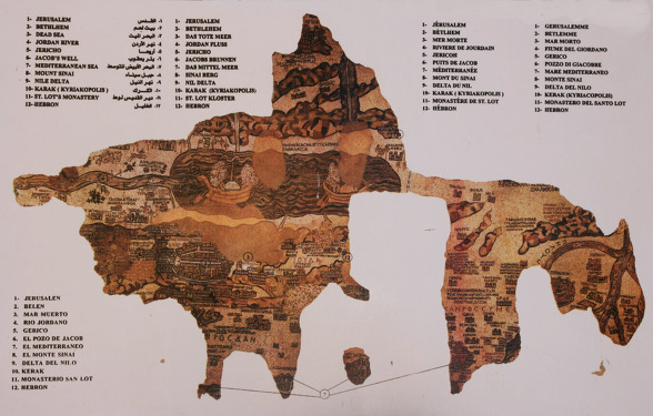 모자이크 지도는 그 중심에 예루살렘이 있고 북쪽으로 레바논에서 남쪽으로는 시나이 반도와 이집트 나일 강 삼각주 그리고 서쪽으로는 지중해에서 동쪽으로는 요르단 사막까지 성경의 땅을 묘사하고 있다. 불행하게도 북쪽 부분은 완전히 파괴되어 없어졌고 남아 있는 부분도 크게 훼손 되었다.