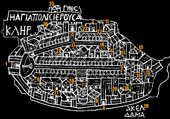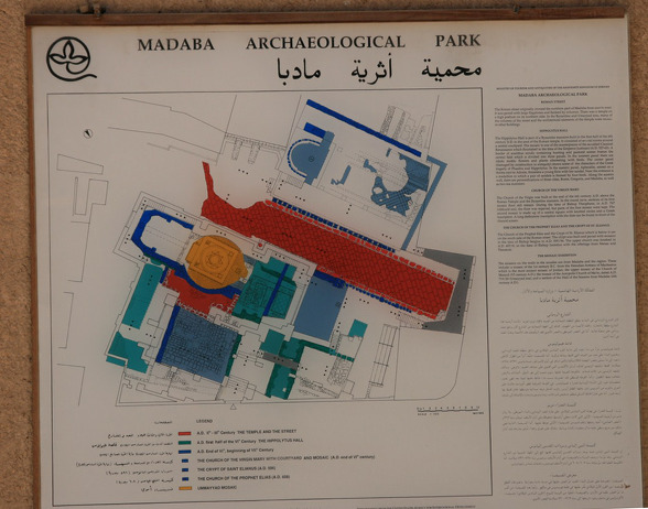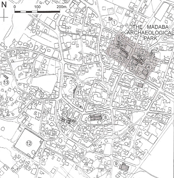 마다바 시의 도면. 1.성 조지 성당. 2.동정녀 성당. 3.예언자 엘리야 성당 4.순나 가족(Sunna' Family) 성당 5.거룩한 순교자들 성당 6.불탄 궁전 7.Salayta 가족 성당 8.주교좌 성당 9.사도들의 성당 10.고고학 박물관 11.상점 12.The Birkeh 13. al-Mishnaqa 성당