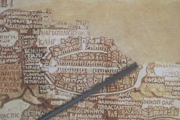 원근법과 항공관찰 기법으로 만들어진 마다바 지도에서 학자들은 156개의 성경 유적지들을 확인하였는데 서로 다른 돌 조각 등을 이용하여 성지의 언덕과 계곡, 마을과 도시들을 묘사 한 후 희랍어로 설명을 첨가 하였다.