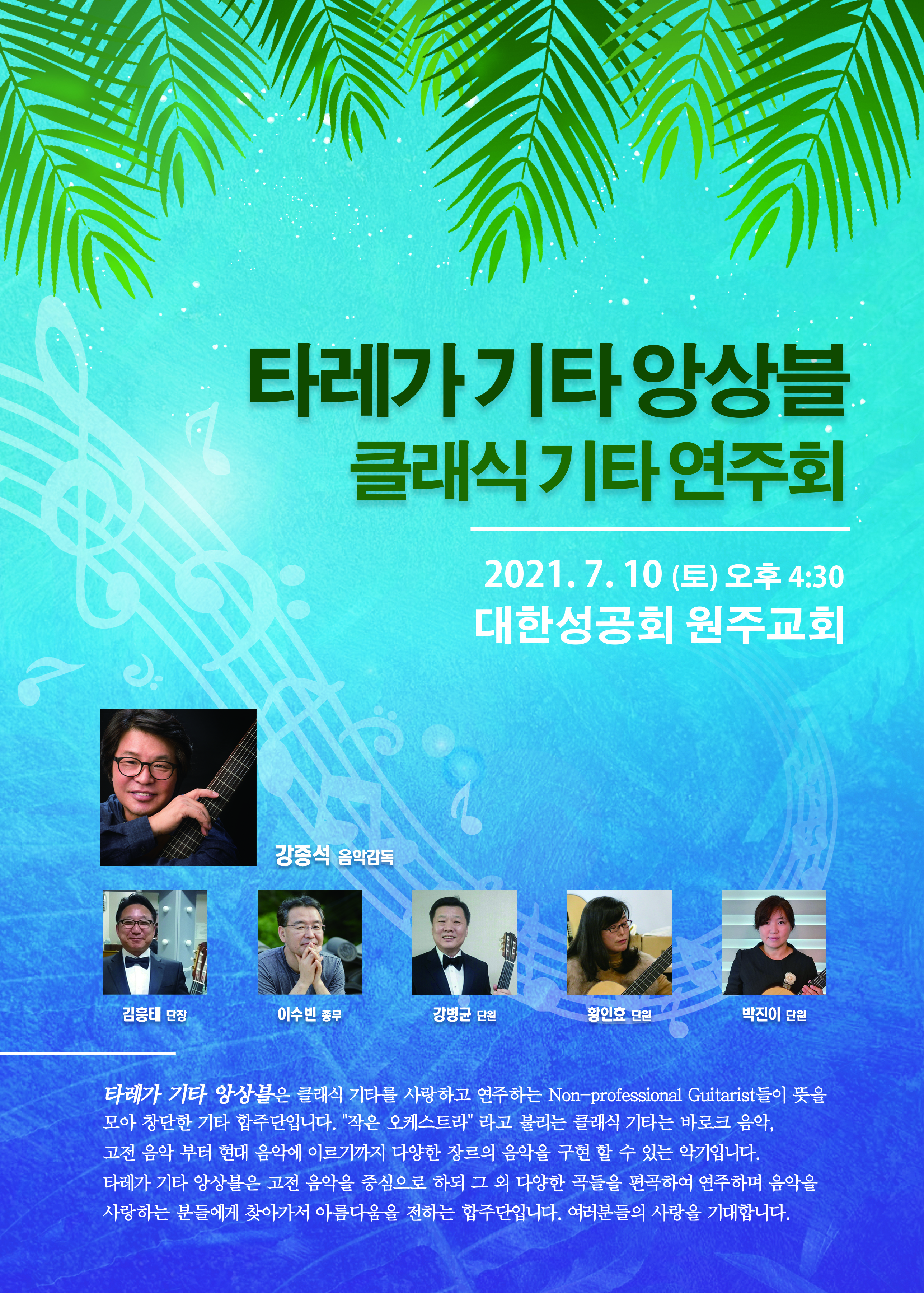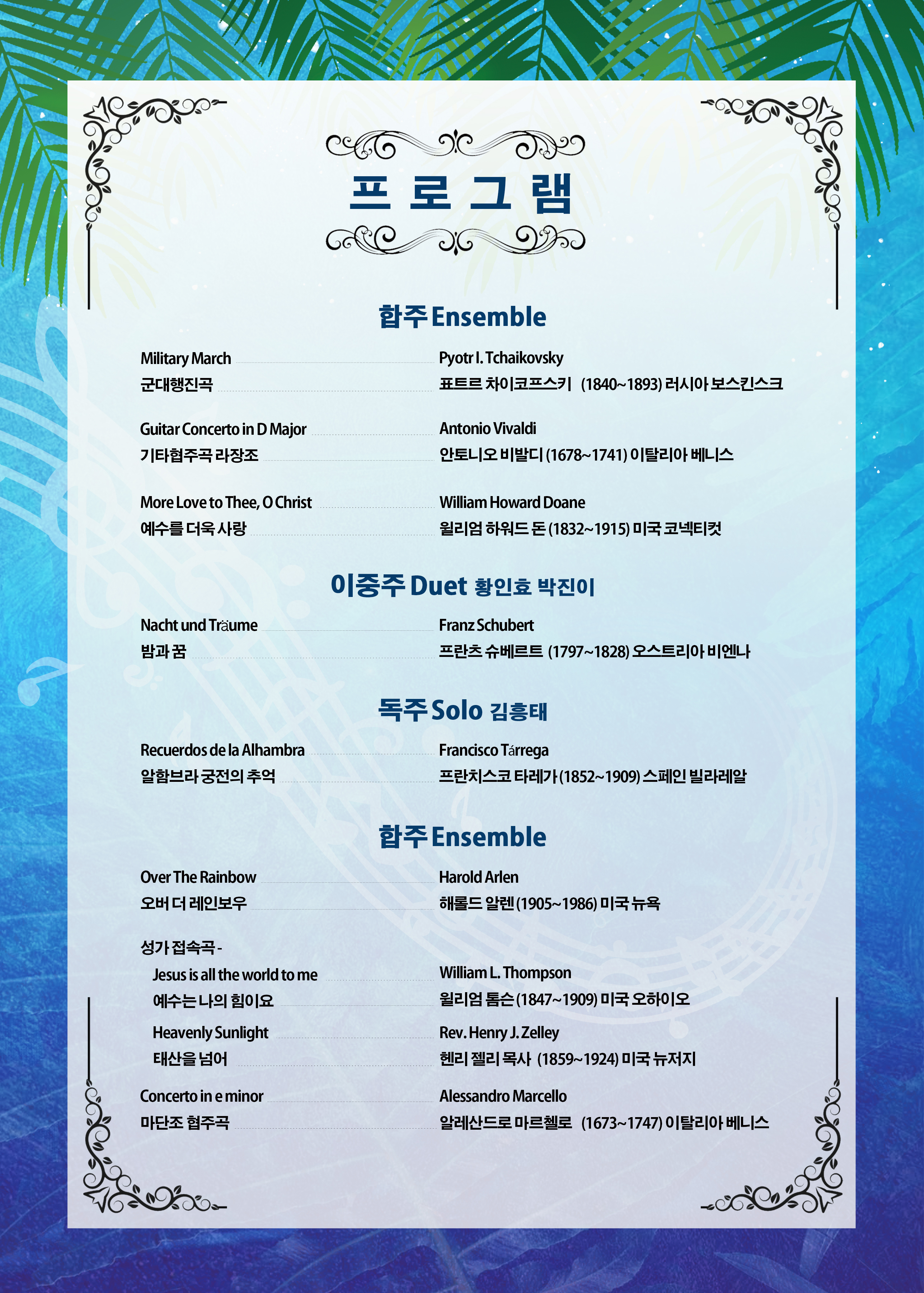| 오후4:30~5:30 | 기타 앙상블 공연 | 클래식기타공연 (강종석 음악감독 외 5명의 단원) 차이코프스키의 군대행진곡, 비발디의 합주곡/성가 연주곡 등 다수 |