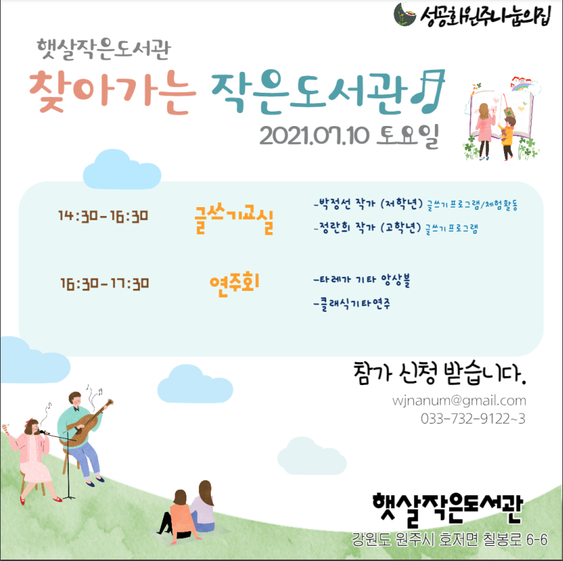 햇살작은도서관은 오는 7월 10일 찾아가는 도서관 행사를 개최합니다. 행사 안에는 글쓰기 교실과 기타 앙상블 공연이 이어집니다. 관심 많이 가져주시기 바랍니다.