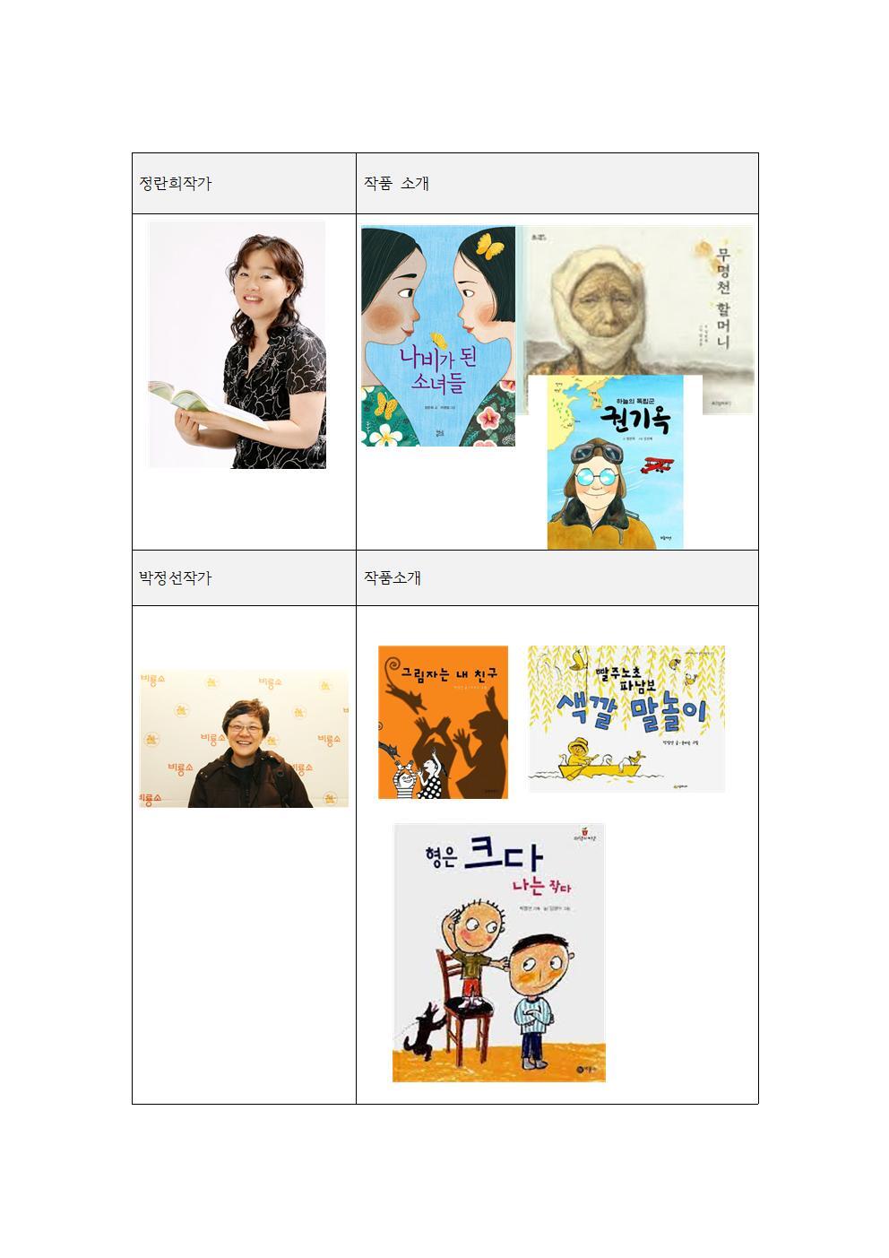 | 오후2:30~4:30 | 글쓰기 행사 | 저학년 글쓰기교실(정란희 작가)/ 고학년 글쓰기교실(박정선 작가) |