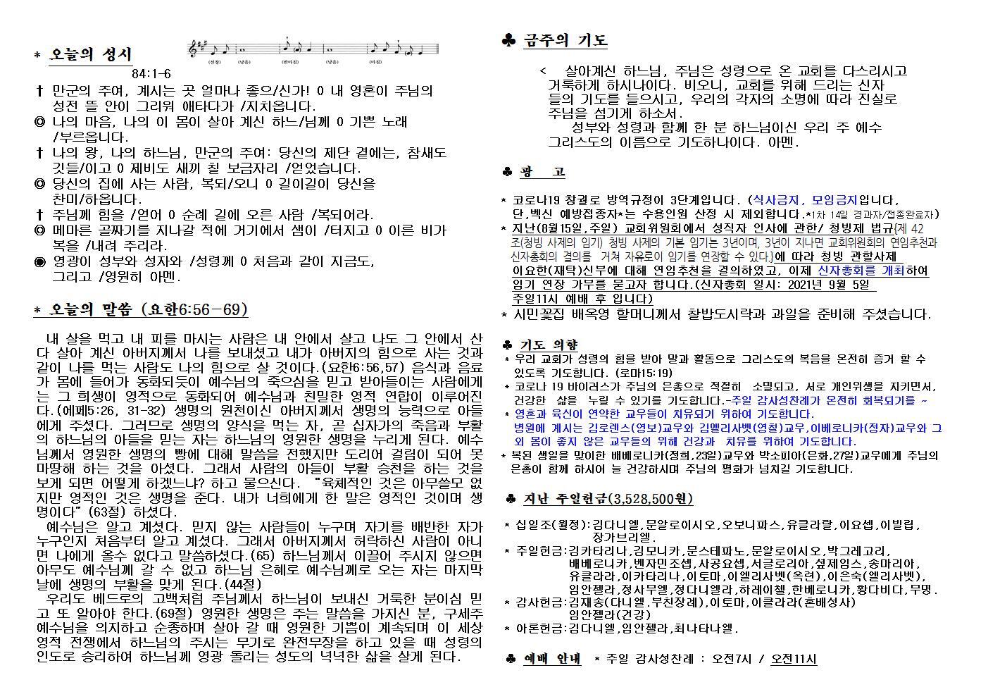 대구교회주보 2021년 8월 22일 연중 21주일 작성자삼위일체|작성시간21.08.21|조회수75 목록 댓글 0 글자크기 작게가 글자크기 크게가 다음검색 현재 게시글 추가 기능 열기 북마크 공유하기 신고 센터로 신고 댓글 댓글 0 댓글쓰기 답글쓰기 댓글 리스트