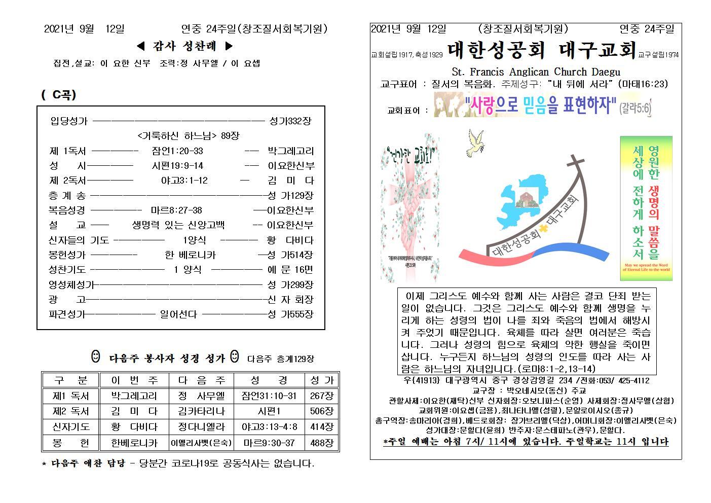 대구교회주보 2021년 9월 12일 연중 24주일 작성자삼위일체|작성시간21.09.11|조회수75 목록 댓글 0 글자크기 작게가 글자크기 크게가 다음검색 현재 게시글 추가 기능 열기 북마크 공유하기 신고 센터로 신고 댓글 댓글 0 댓글쓰기 답글쓰기 댓글 리스트