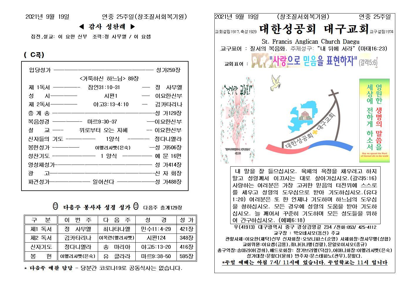 대구교회주보 2021년 9월 19일 연중 25주일 작성자삼위일체|작성시간21.09.17|조회수81 목록 댓글 0 글자크기 작게가 글자크기 크게가 다음검색 현재 게시글 추가 기능 열기 북마크 공유하기 신고 센터로 신고 댓글 댓글 0 댓글쓰기 답글쓰기 댓글 리스트