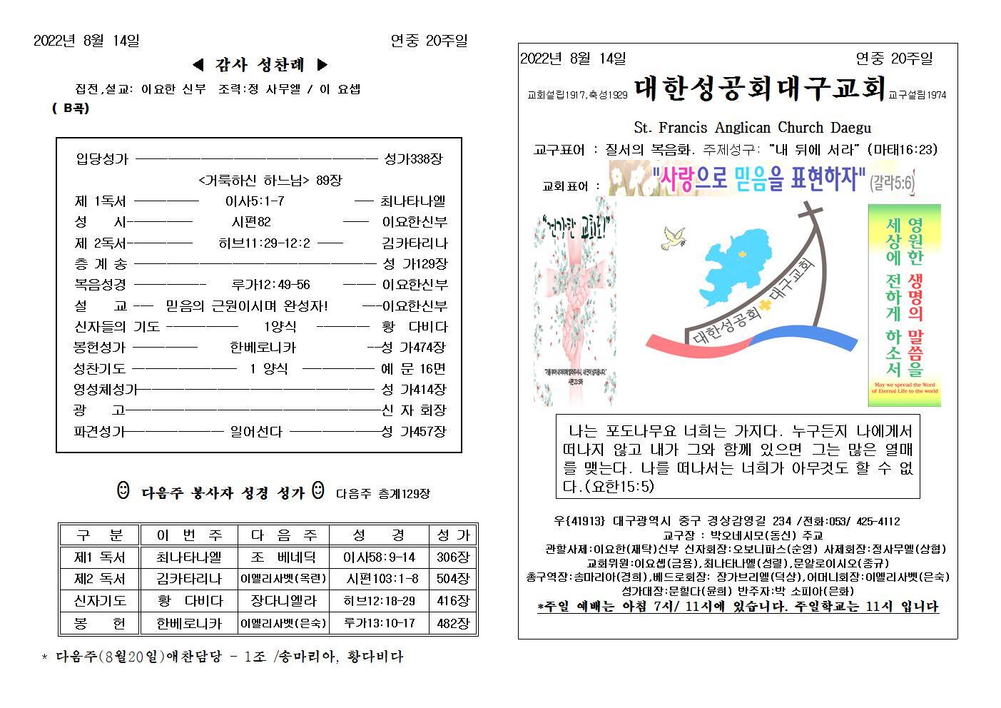 대구교회주보 2022년 8월14 연중 20주일 작성자삼위일체|작성시간22.08.13|조회수114 목록 댓글 0 글자크기 작게가 글자크기 크게가 다음검색 현재 게시글 추가 기능 열기 북마크 공유하기 신고 센터로 신고 댓글 댓글 0 댓글쓰기 답글쓰기 댓글 리스트