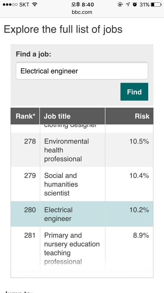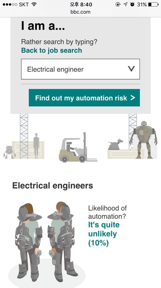 인공지능이 발전하게 된다면 현재의 인간의 삶에 미치는 영향에 좋은 점도 있겠지만, 인간의 영역을 대신하게 되어 우리의 일자리를 위협하는 부분도 분명히 있을텐데요. 현재 우리가 공부하고 있는 전기기사/산업기사와 관련된 직업인 전기기사/기술자에는 얼마나 영향을 미칠까요? 영국의 BBC가 조사한 자료에 검색해보니 366개의 직업 중 Electrical Engineer 전기기술자는 280등 으로 인공지능 로봇으로 대체될 가능성이 별로 없는 것으로 나오네요. 아무리 인공지능이 뛰어나다고 해도 전기로 움직이는 기계에 불과하니 전기를 다루는 전기기술자를 대체를 하기보다는 오히려 필요로 할 것으로 예상됩니다. 따라서 우리 전기공부하시는 분들 모두 자부심을 갖고 힘을 내시기 바랍니다. (출처: BBC News, http://www.bbc.com/news/technology-34066941)