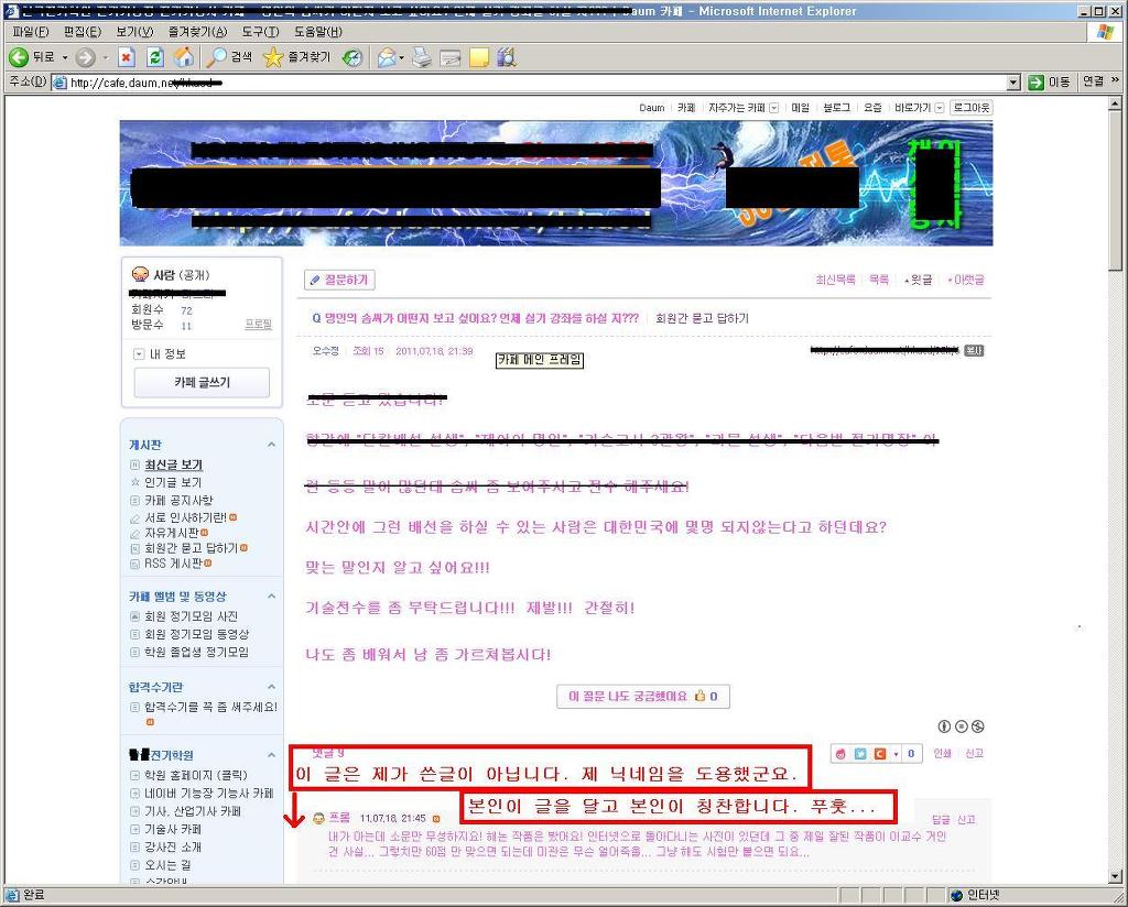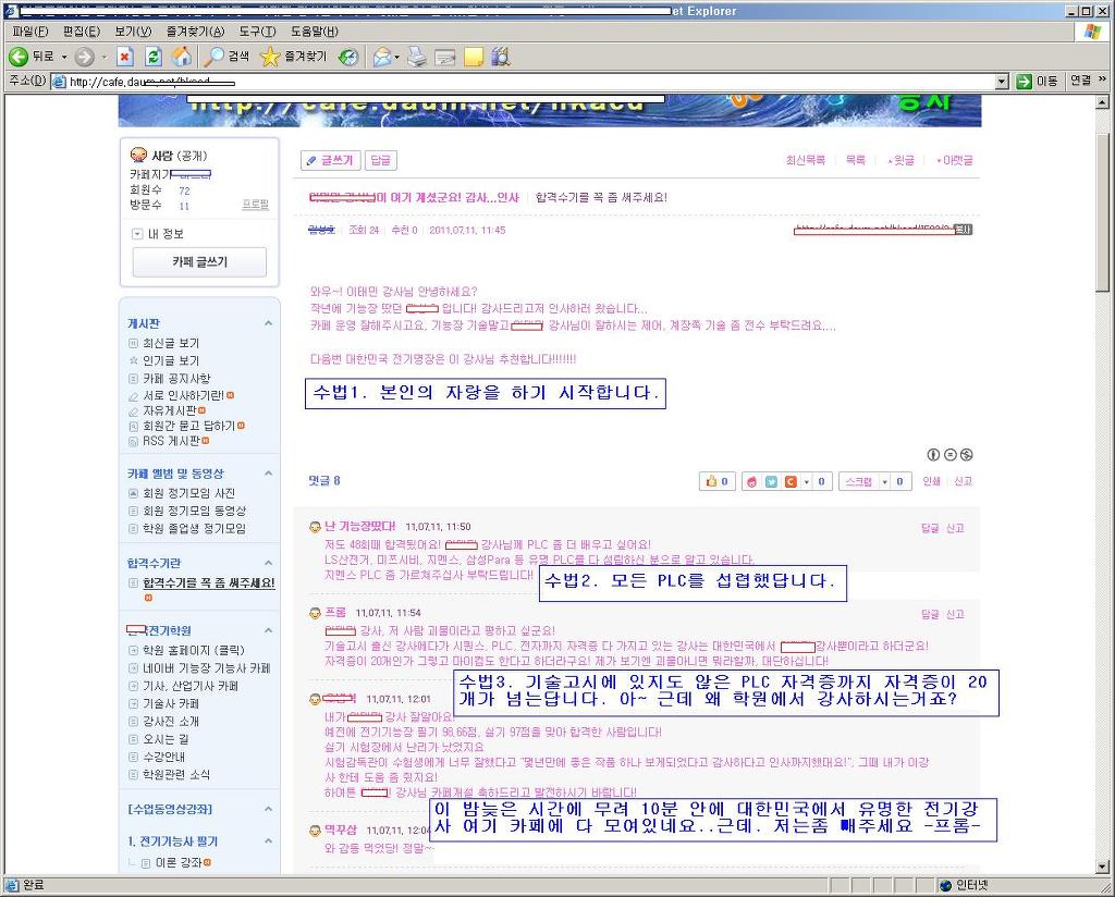ps. 정말정말 손발이 오그라드는 부끄러운 내용의 캡쳐 사진을 올립니다. 해당 카페는 현재 폐쇄단계에 있습니다.
