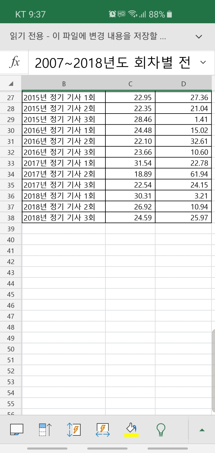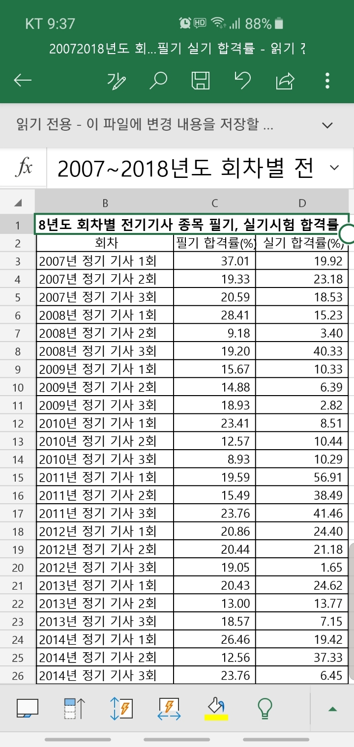 2007년~2018년 회차별 전기기사 종목 필기, 실기시험 합격률 작성자진격의 진군|작성시간19.11.08|조회수14,632 목록 댓글 8 글자크기 작게가 글자크기 크게가 ... 다음검색 현재 게시글 추가 기능 열기 북마크 공유하기 신고 센터로 신고 댓글 댓글 8 댓글쓰기 답글쓰기 댓글 리스트 작성자강미아빠 | 작성시간 19.12.28 2010년 3회 정말 어려워나 보내요 좋은 정보 감사합니다. 작성자전기따보쟙 | 작성시간 20.04.29 원하던 자료였습니다 감사합니다 작성자ㅇㅇ2837 | 작성시간 20.05.05 감사합니다 작성자김영필 | 작성시간 20.06.09 잘 봤습니다.. 작성자마메보이 | 작성시간 21.05.01 좋은 자료 감사합니다. 실기공부 하면서 궁금했던 적이 많았는데 감사합니다 댓글 전체보기