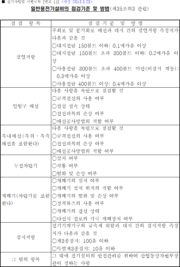 (참조로 2021년 1.1부터 절연저항 기준치가 바뀔 예정입니다. 현재 110V 0.1MΩ, 220V 0.2MΩ, 380V 0.3MΩ, 440V 0.4MΩ이상에서 220V 이상이면 1MΩ 이상이도록 개정됩니다. 2021년부터 국내의 저압기준이 교류 1000V, 직류 1500V 이하로 국제기준과 통일되기 때문에 절연저항기준이 바뀌는 것이니 참조하시기 바랍니다)