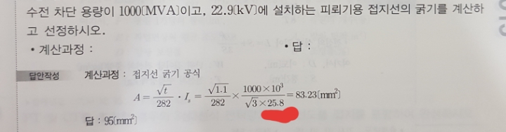 작성자rlaclrb2 작성시간 19.10.13 잘못된 해설입니다. 위 해설의 전류는 3상 고장전류 계산을 나타내는 것입니다. 22.9kV이므로 전류값은 피뢰기 방전전류를 고려한다면 2.5kA를 넣음이 바람직하지만 1선지락 시 고장전류의 값은 22스퀘어 이상으로 적용(CNCV 중성선 굵기는 22스퀘어입니다.)이므로 일반적으로 25스퀘어 혹은 35스퀘어를 적용합니다. 위 문제집과 같은 풀이로 오해가 없으시기 바랍니다.