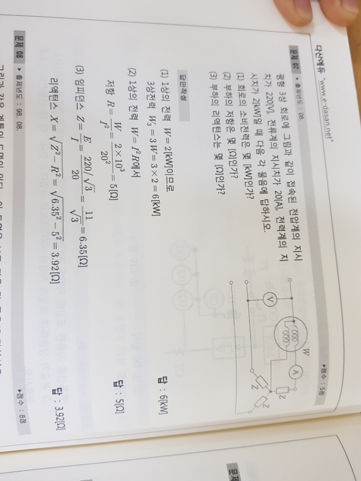 작성자3회차 준비생 작성시간 19.08.18 전력계W에서 지시하는 전력값은 부하 한상의 임피던스에 걸리는 전력을 의미하구요~ 소비전력은 부하가 3상이기때문에 전력계가 지시하는 값에다가 곱하기 3을 해주는 거에요~