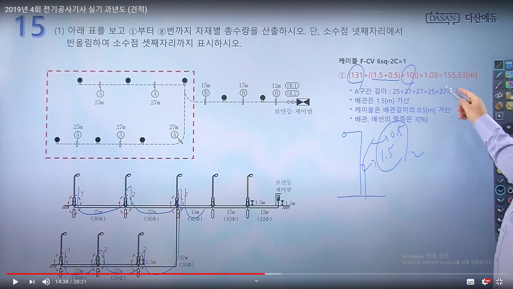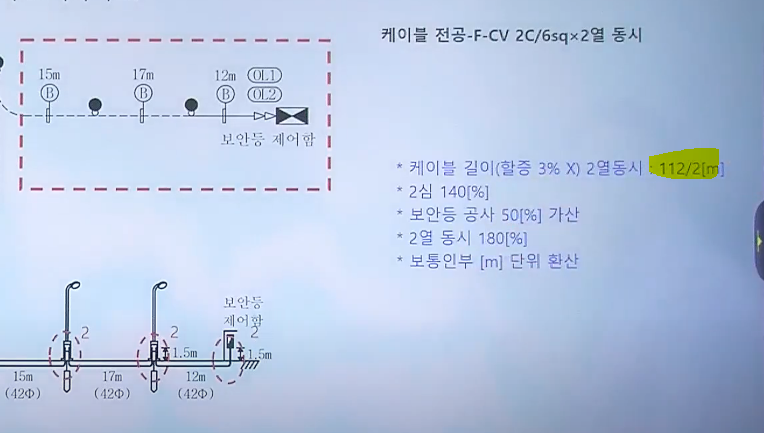 질문 1) 보안등 제어함에서 42c관 내에 2심전선 2가닥으로만 나와서 3번째 보안등에서 42c 2심 2가닥 올라가고 그게 나뉘어서 36c관 두개에 2심짜리 2가닥 올라온게 36c관 두개로 나뉘어 각 각 1가닥씩 들어간다는 말씀 인가요?
