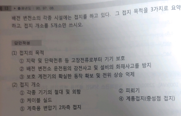3가지로 요약하시오! 라는데.. 사실 문제에 있는 접지의 목적 란에 있는 정답들은 따져보면 5개 외우는 것이 되는 거죠? 예를 들어.. 1.운전원의 감전사고 방지