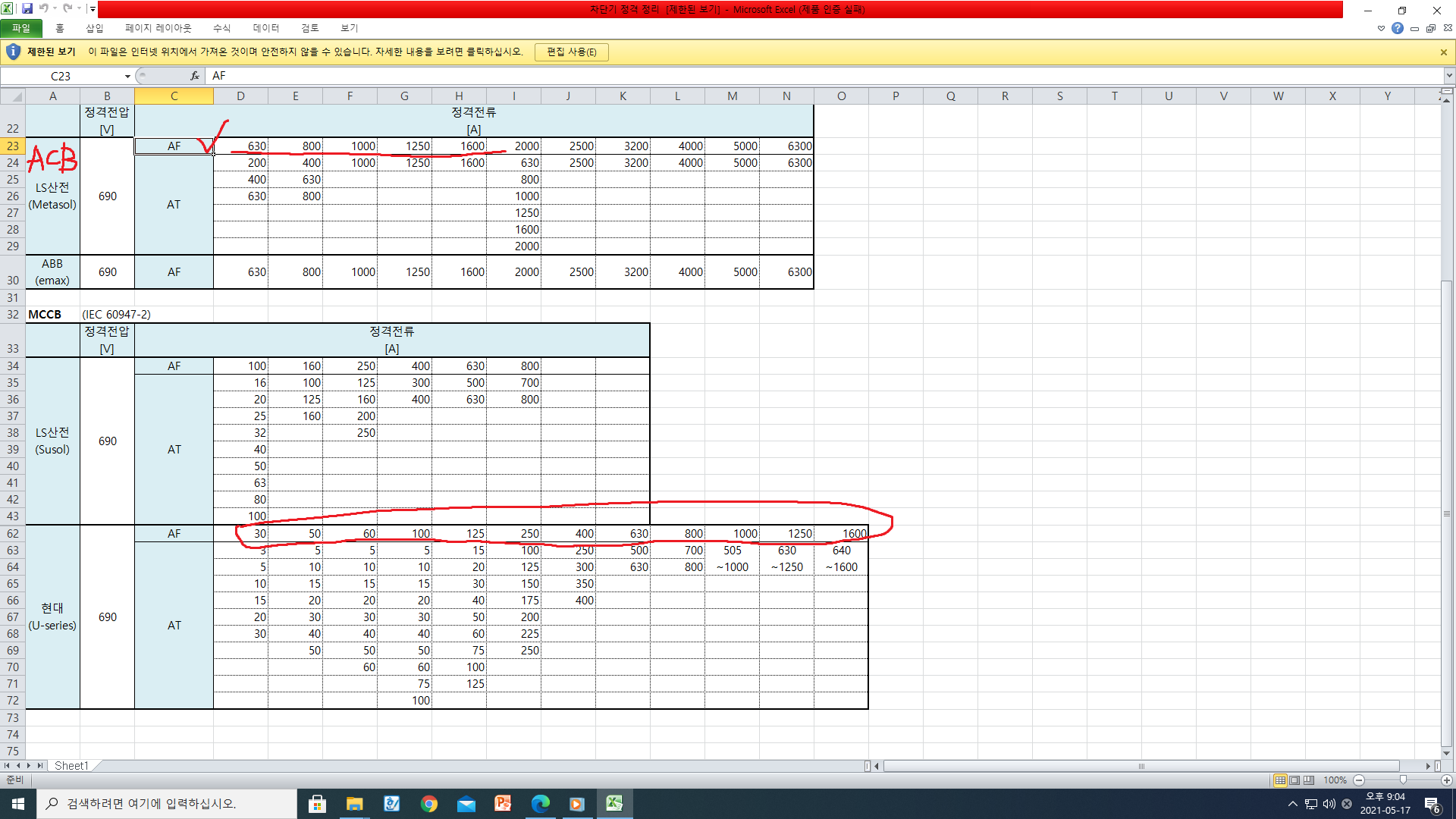 ■ 첨부하신 엑셀파일은 kec 제정 이전 정리된 파일로, 해당 엑셀파일은 제조사별 정격을 정리한 파일입니다.